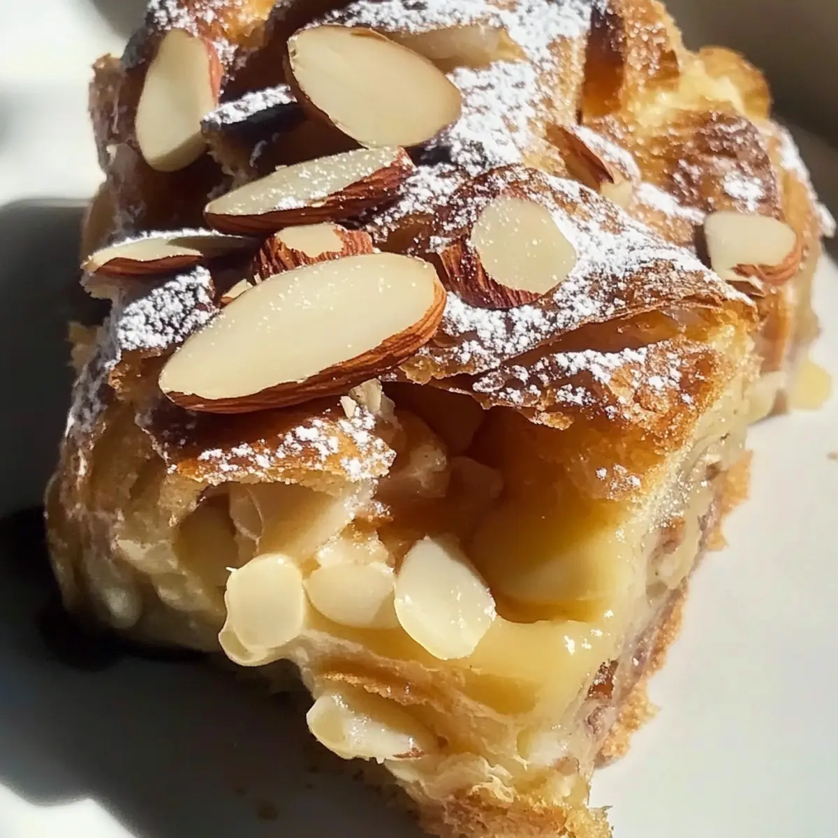 - Pour the custard mixture evenly over the arranged croissants, ensuring they are fully coated. Sprinkle sliced almonds on top.