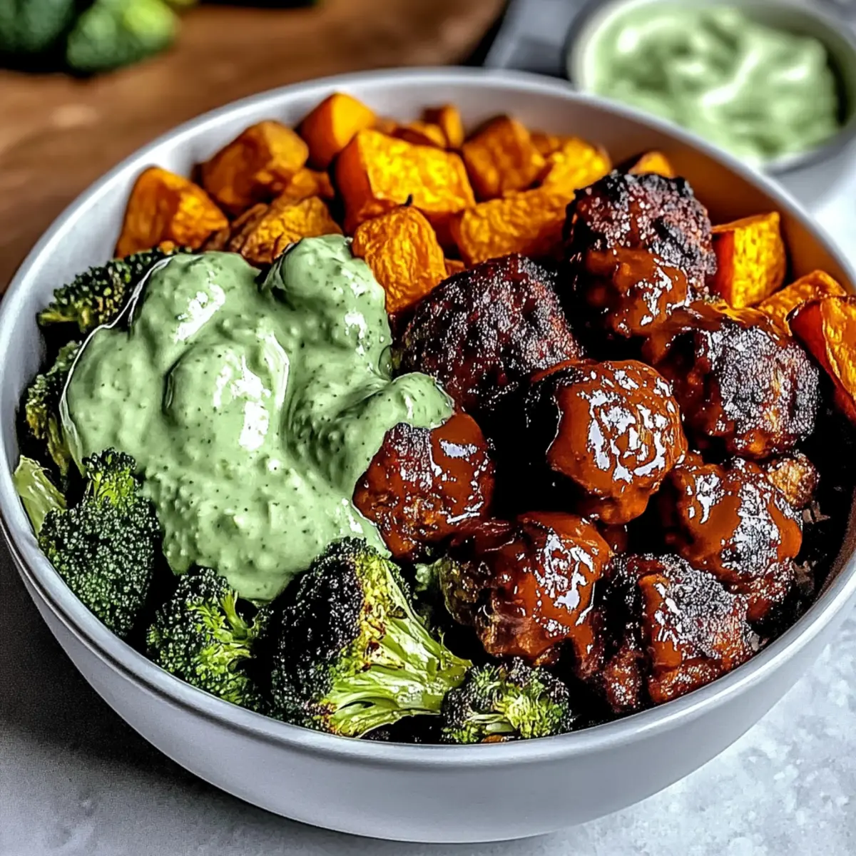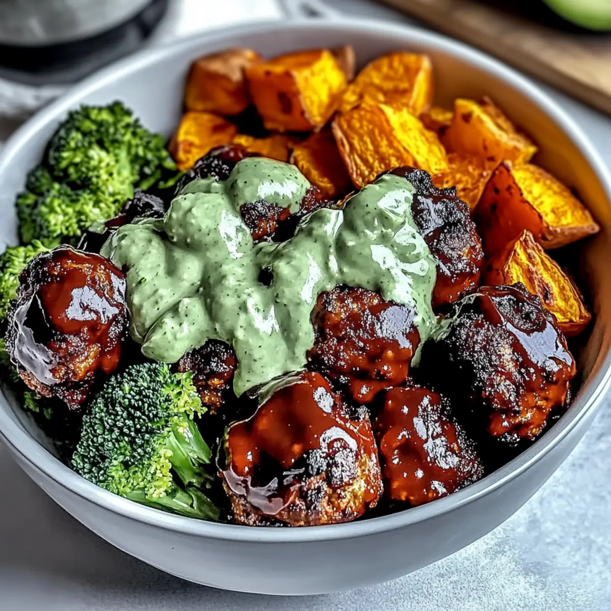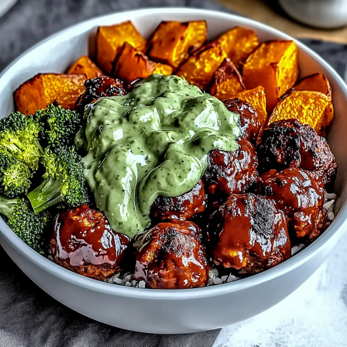 The aroma of barbecue wafts through the kitchen, instantly transporting me to summer cookouts and laughter-filled evenings. Today, I’m excited to share my go-to comfort dish: Barbecue Meatball Bowls with Creamy Avocado Sauce. This recipe not only brings together succulent, protein-packed meatballs glazed in tangy barbecue sauce, but it also features roasted sweet potatoes and vibrant broccoli—making it a healthy meal that’s perfect for the whole family. What I love most is that it’s meal prep-friendly and easily customizable for different dietary needs, whether you opt for gluten-free or vegan variations. Imagine whipping this up on a busy weeknight while still enjoying a wholesome, satisfying dinner. Curious how to assemble these delightful bowls? Let’s dive in!