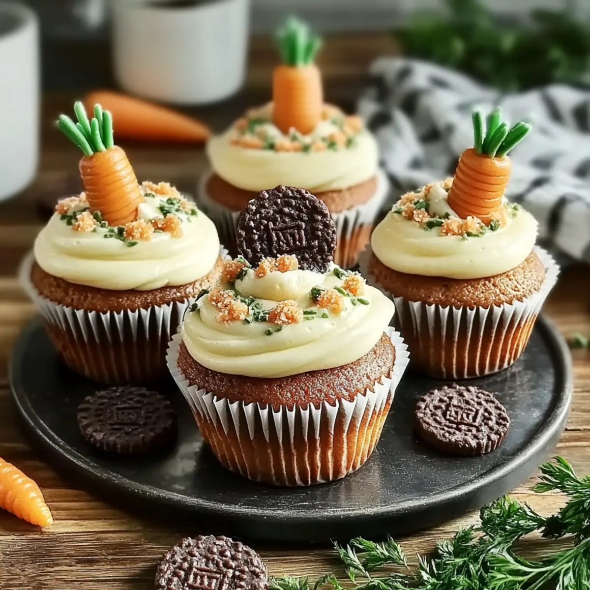 Take the crushed chocolate sandwich cookies and sprinkle them generously over the frosted cupcakes to mimic soil in a garden setting. Lastly, top each cupcake with fondant or candy carrots, adding a whimsical and playful touch, making these Carrot Patch Cupcakes irresistible to both young and old!