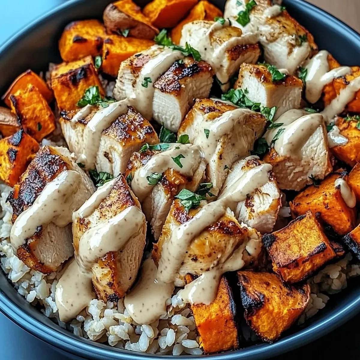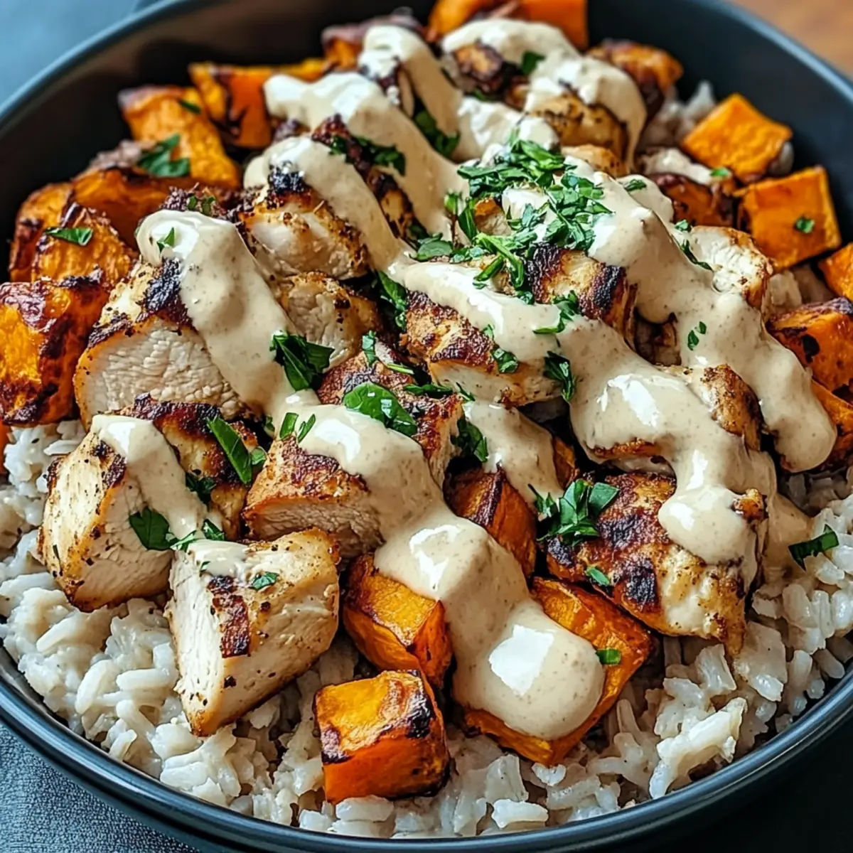 Delicious Chicken & Sweet Potato Rice Bowl with Tahini Drizzle