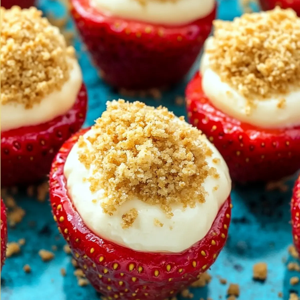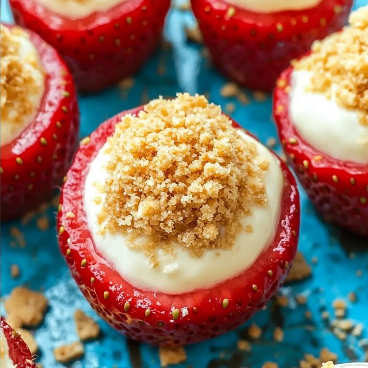 To add a delightful crunch, sprinkle crushed graham crackers over the filled strawberries, mimicking a traditional cheesecake crust. For best flavor, chill the assembled cheesecake-stuffed strawberries in the refrigerator for about 15 minutes before serving. This short chill time enhances the flavors and provides a refreshing treat, perfect for sharing with loved ones or enjoying on a sunny day.