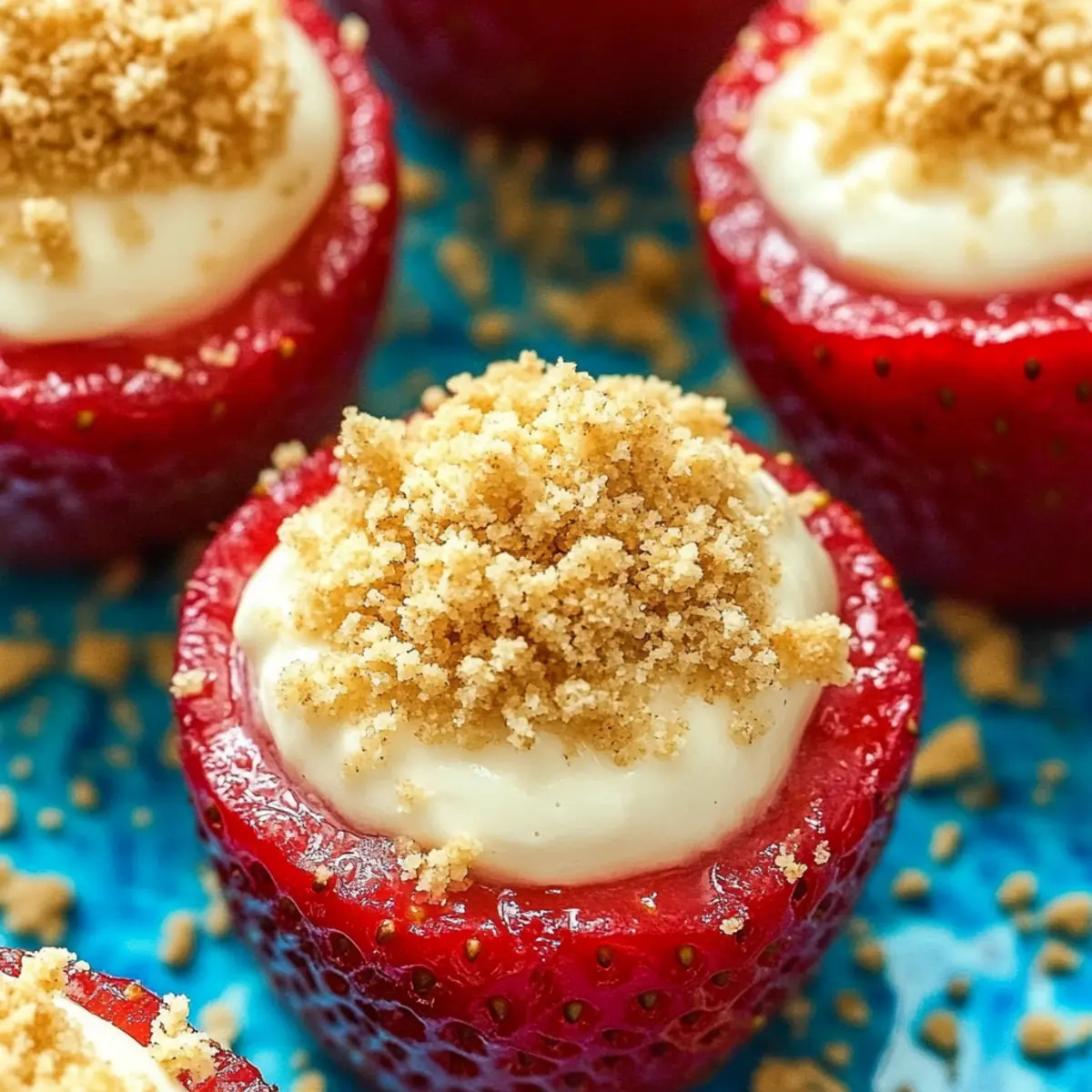 - Sprinkle crushed graham crackers over the filled strawberries, mimicking a traditional cheesecake crust. For best flavor, chill the assembled cheesecake-stuffed strawberries in the refrigerator for about 15 minutes before serving.