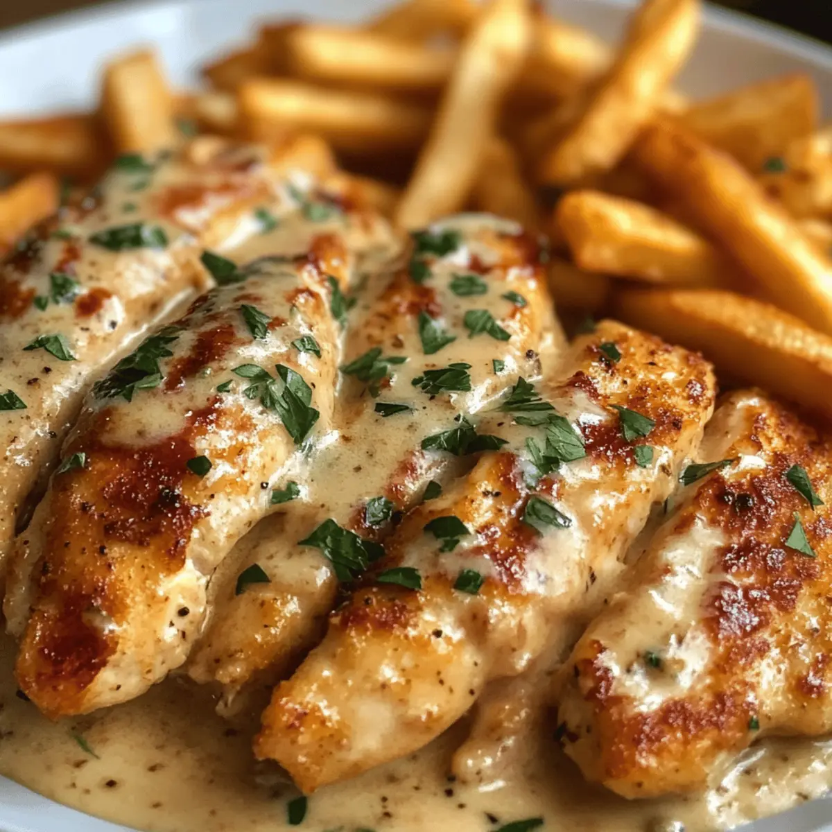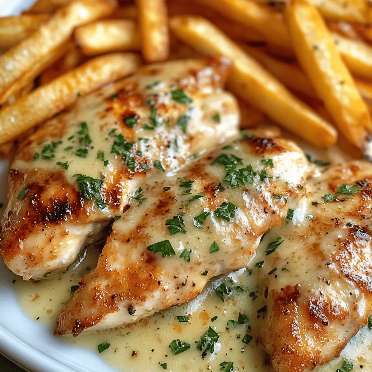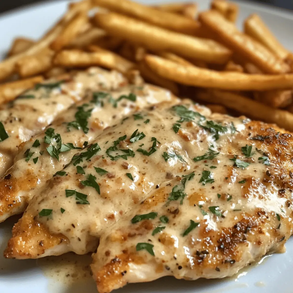 Plate each chicken fillet with a side of your crispy fries and drizzle with the remaining sauce. For an extra touch, garnish with freshly chopped parsley. This Chicken Fillet in Spicy, Creamy Garlic-Parmesan Sauce is now ready to be enjoyed—each bite offering a comforting blend of smooth, rich sauces and satisfying crunches from the fries.