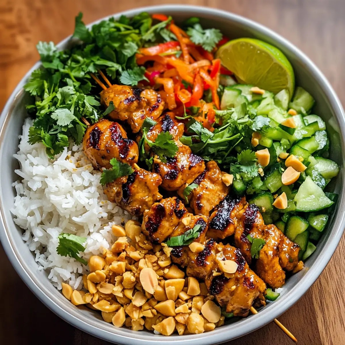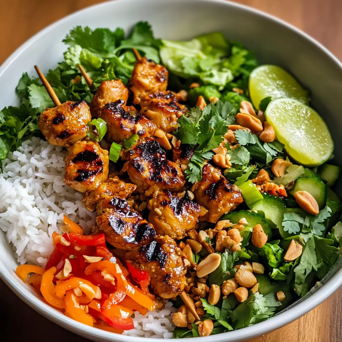 Once the chicken is cooked through, remove the skewers from the skillet and let them rest for a couple of minutes. To assemble your Chicken Satay Spring Roll Bowls, place a base of rice, rice noodles, or fresh vegetables in each bowl. Top with the skewered chicken, and add a sprinkle of fresh cilantro, a squeeze of lime juice, and chopped peanuts for a delightful crunch.