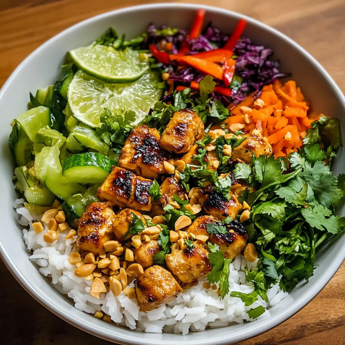 Vibrant Presentation: Layer your bowls with colorful vegetables and fresh herbs for a stunning visual appeal, making your Chicken Satay Spring Roll Bowls as delightful to look at as they are to eat!