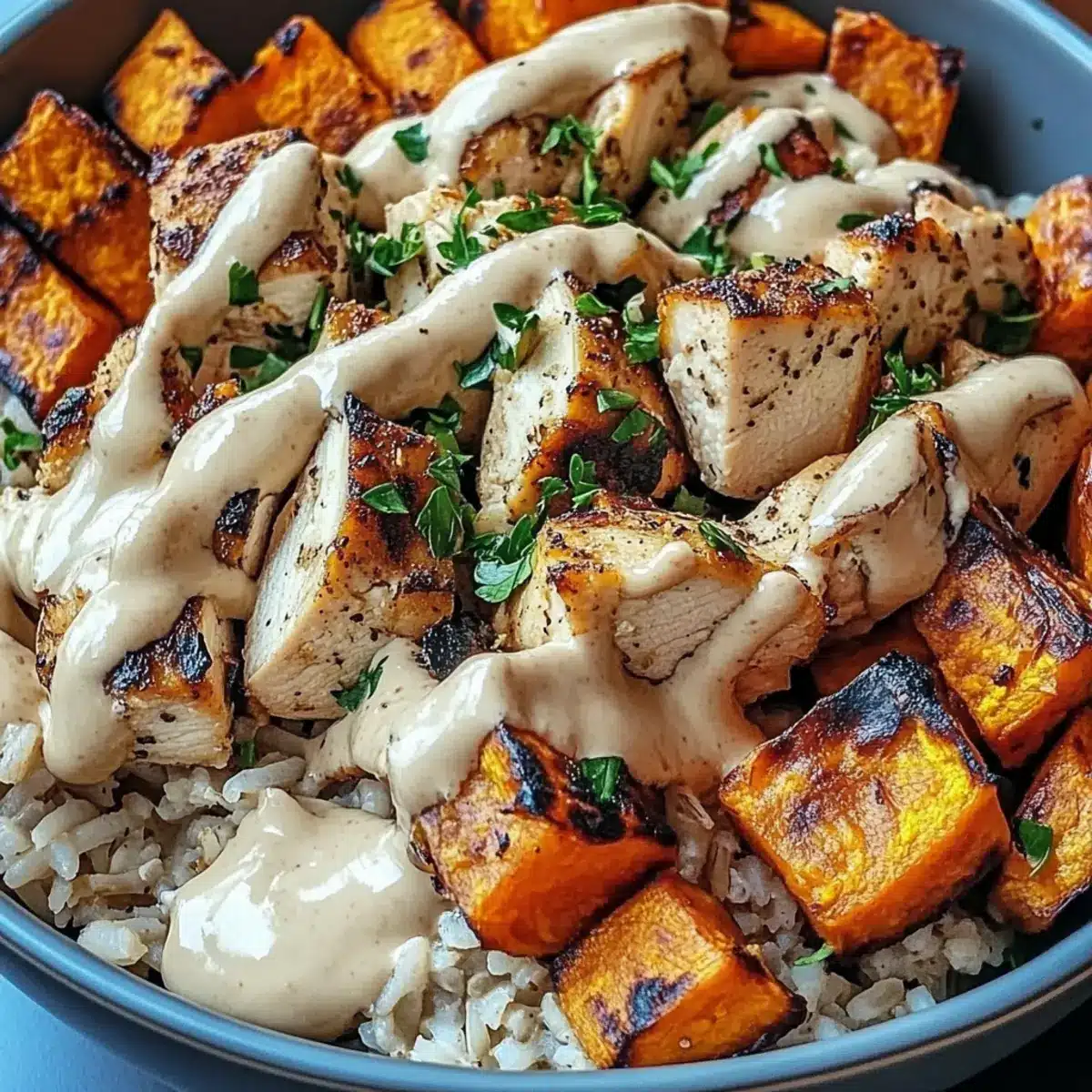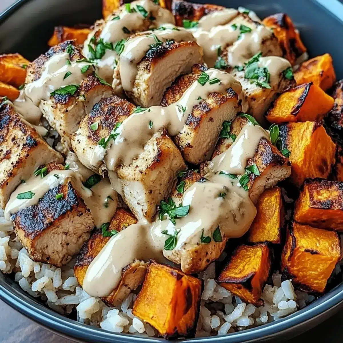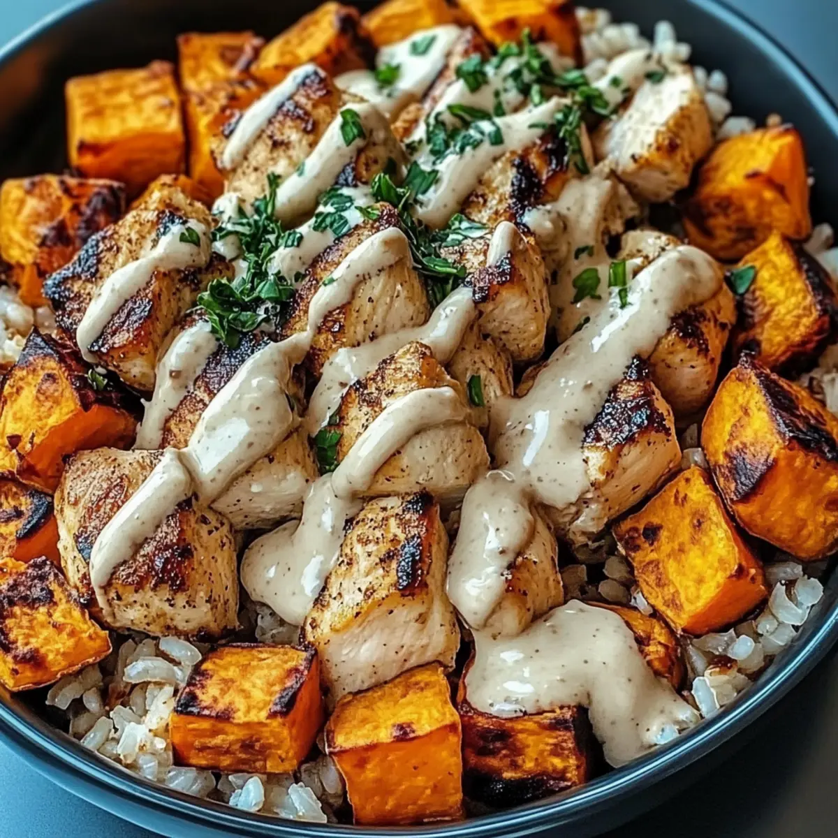 - Assemble the bowls with brown rice, sautéed chicken, roasted sweet potatoes, and drizzle with tahini sauce. Serve warm.