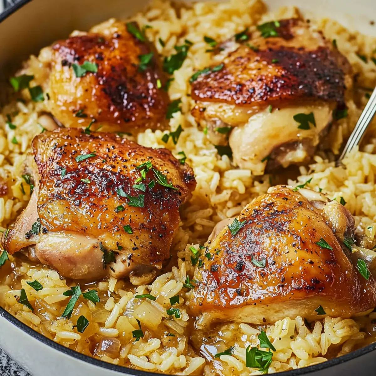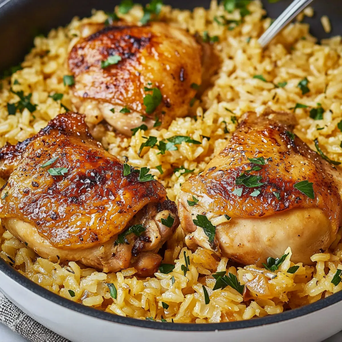 Comforting Simplicity: This one-pan dish brings together juicy chicken thighs and fluffy garlic rice with minimal effort, making it perfect for busy nights.