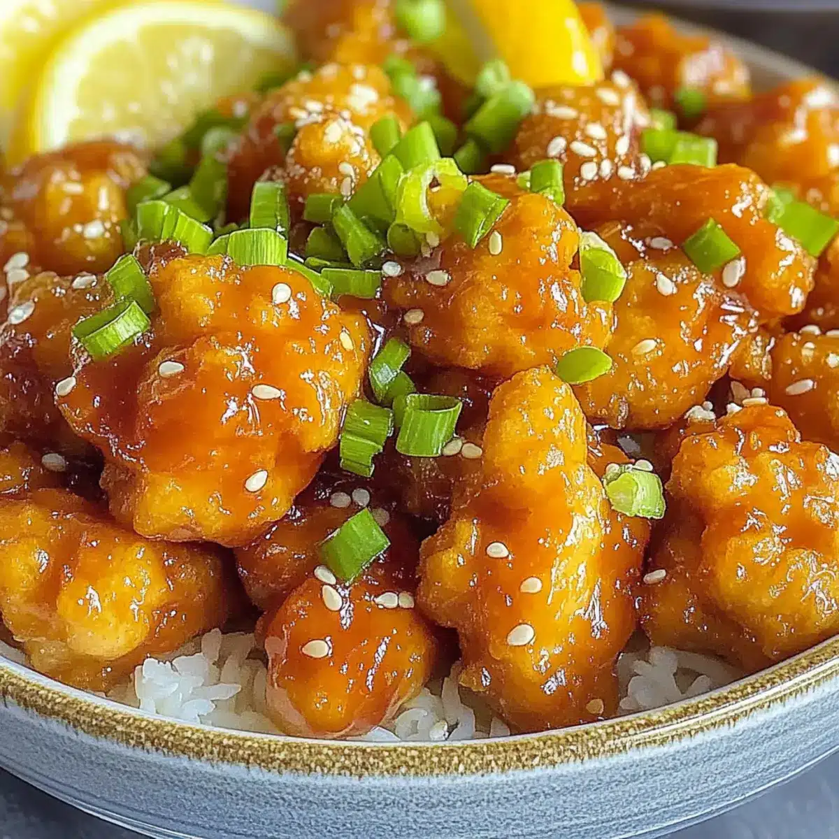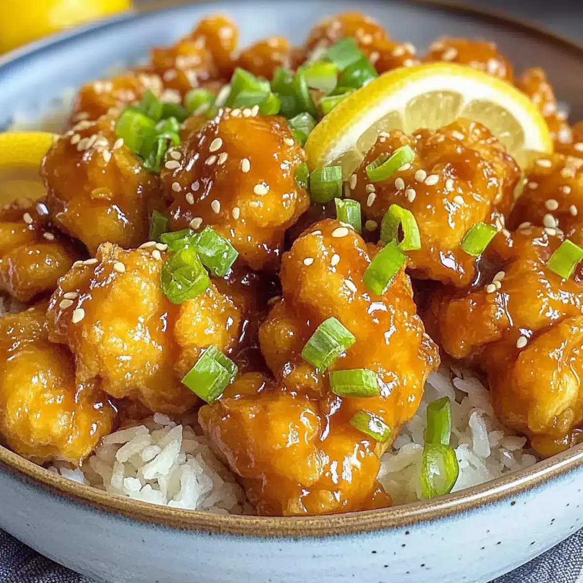 - Serve your Chinese Lemon Chicken garnished with lemon slices, green onions, and sesame seeds.