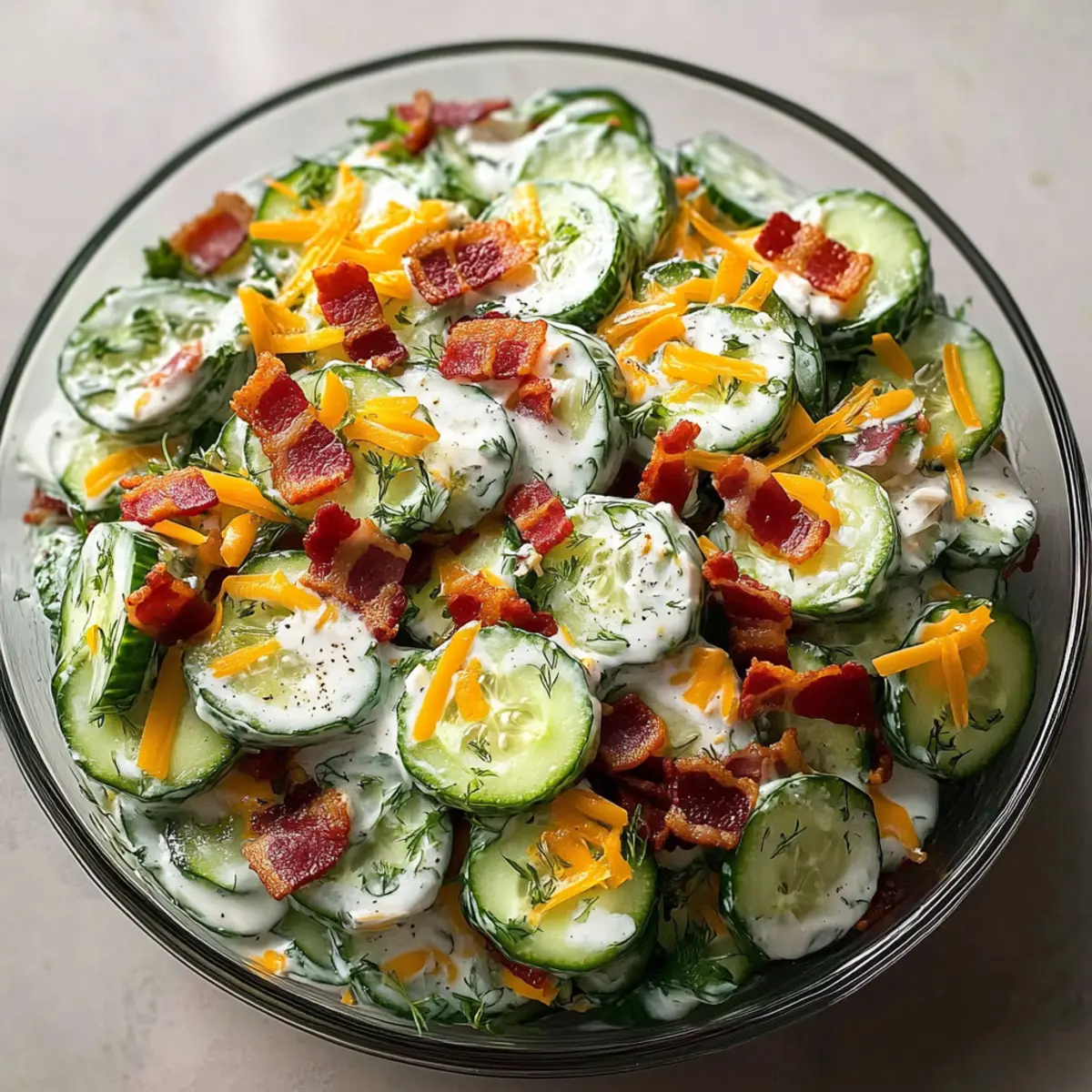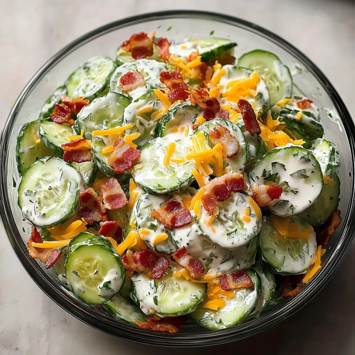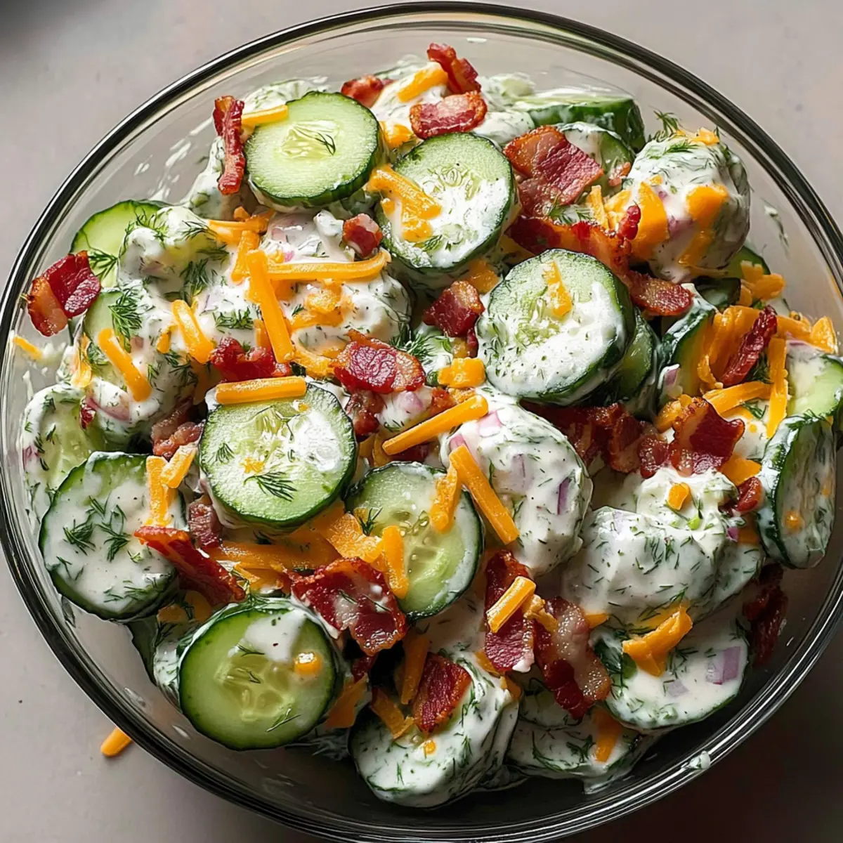- Add crumbled bacon, cheddar cheese, red onion, and dill to the cucumbers and fold together gently.