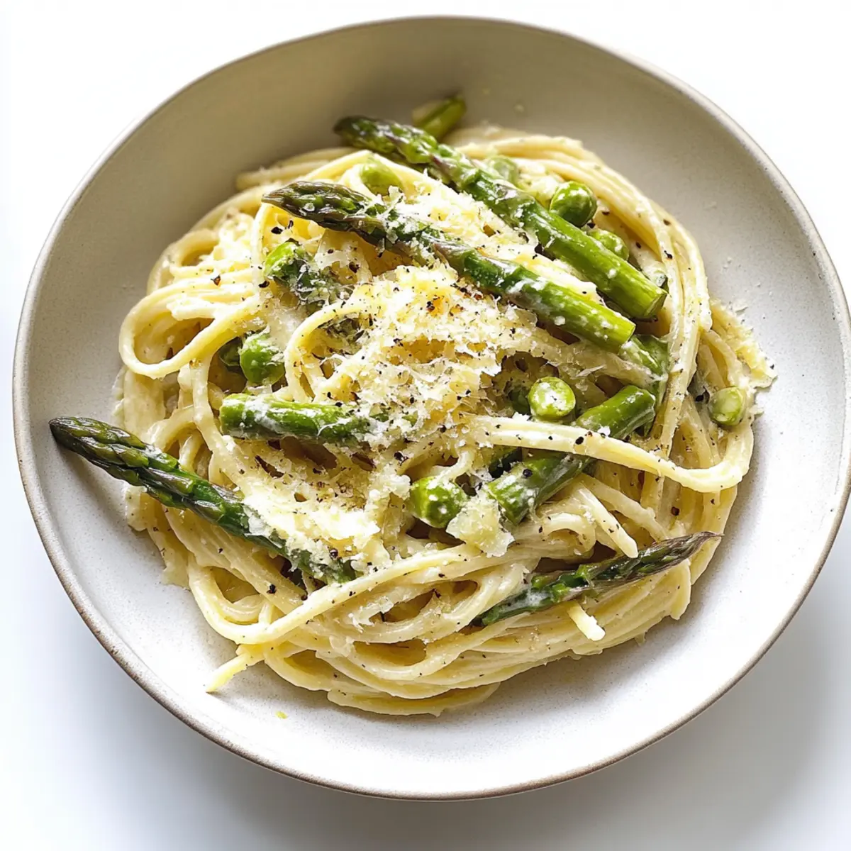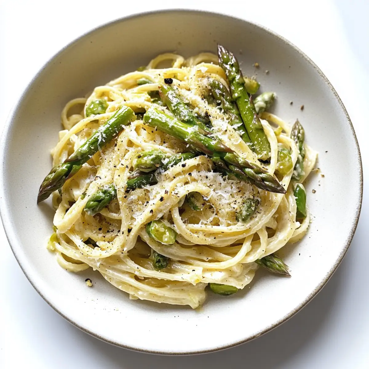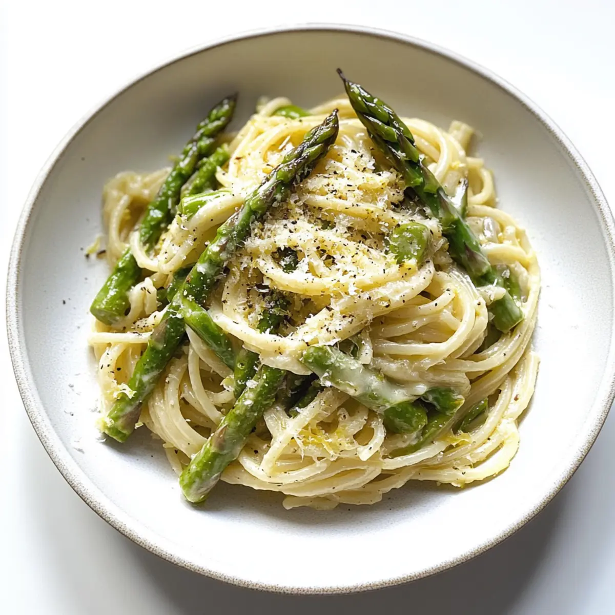 Plate your creamy asparagus pasta with care, topping each serving with the remaining asparagus and additional lemon zest. Finish with a sprinkle of grated Parmesan and a few cracks of black pepper for an inviting presentation that captures the essence of this quick, zesty meal.