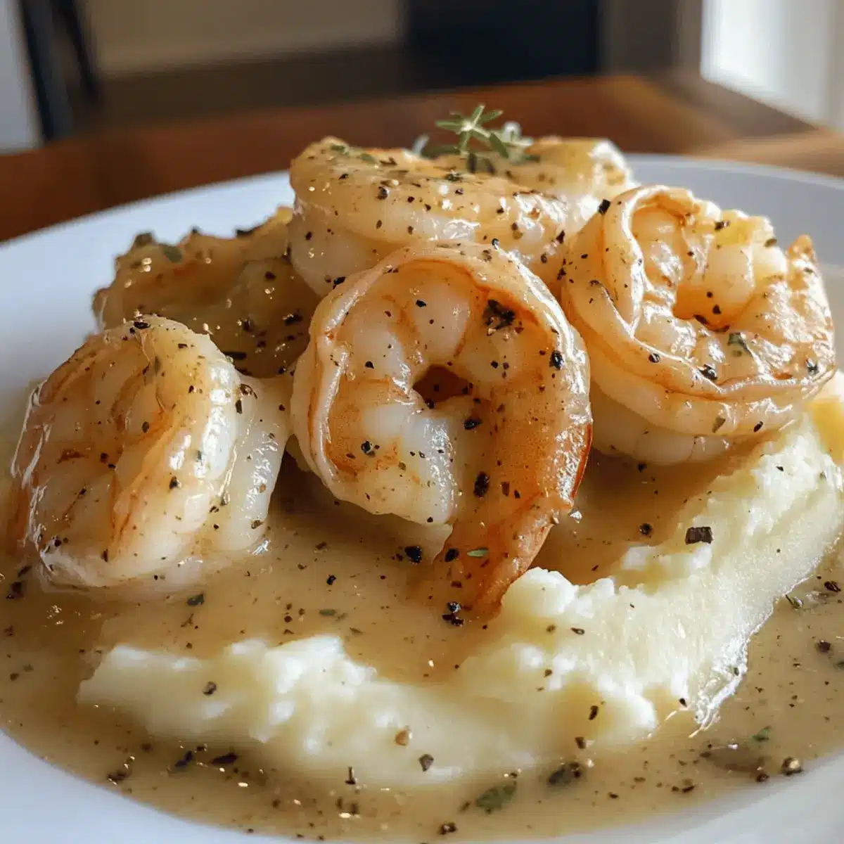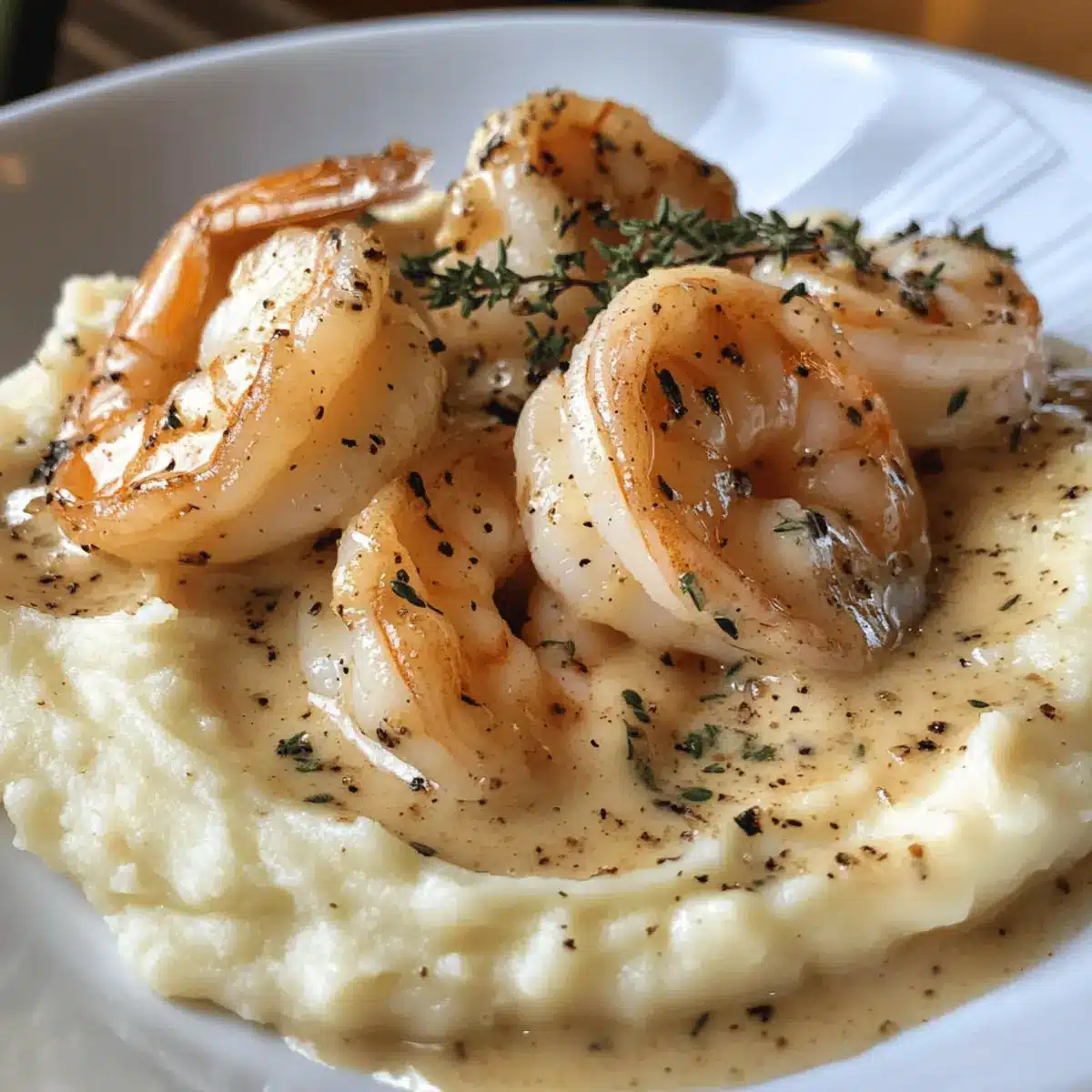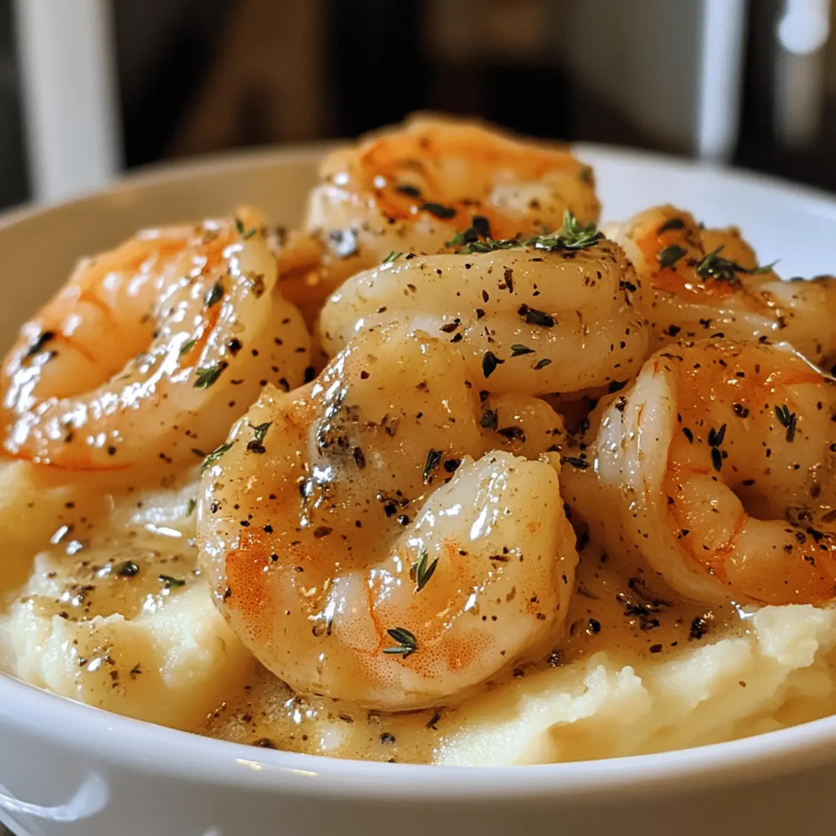 - Serve mashed potatoes on plates, top with shrimp, drizzle with sauce, and garnish with fresh thyme.