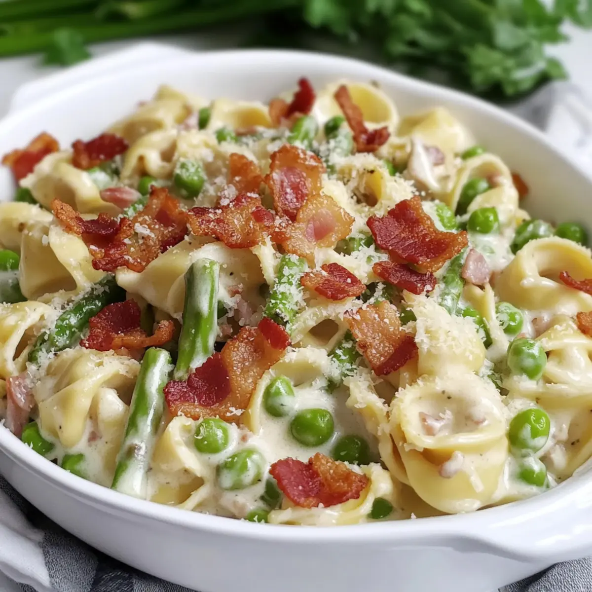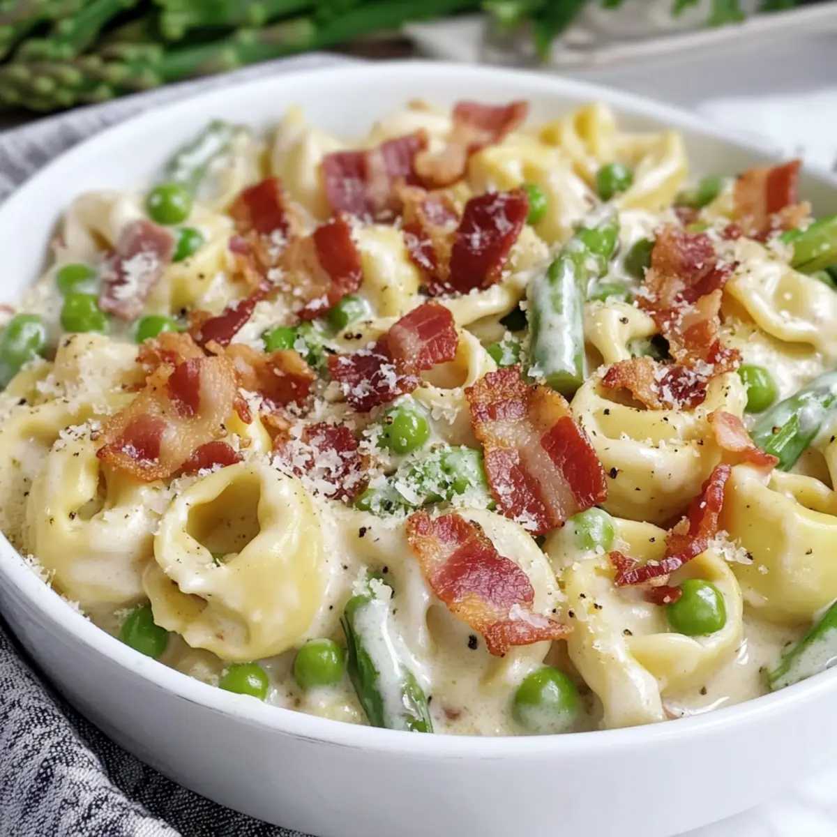 Creamy Tortellini with Peas Asparagus and Bacon Delight