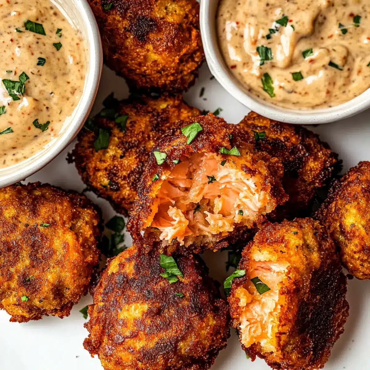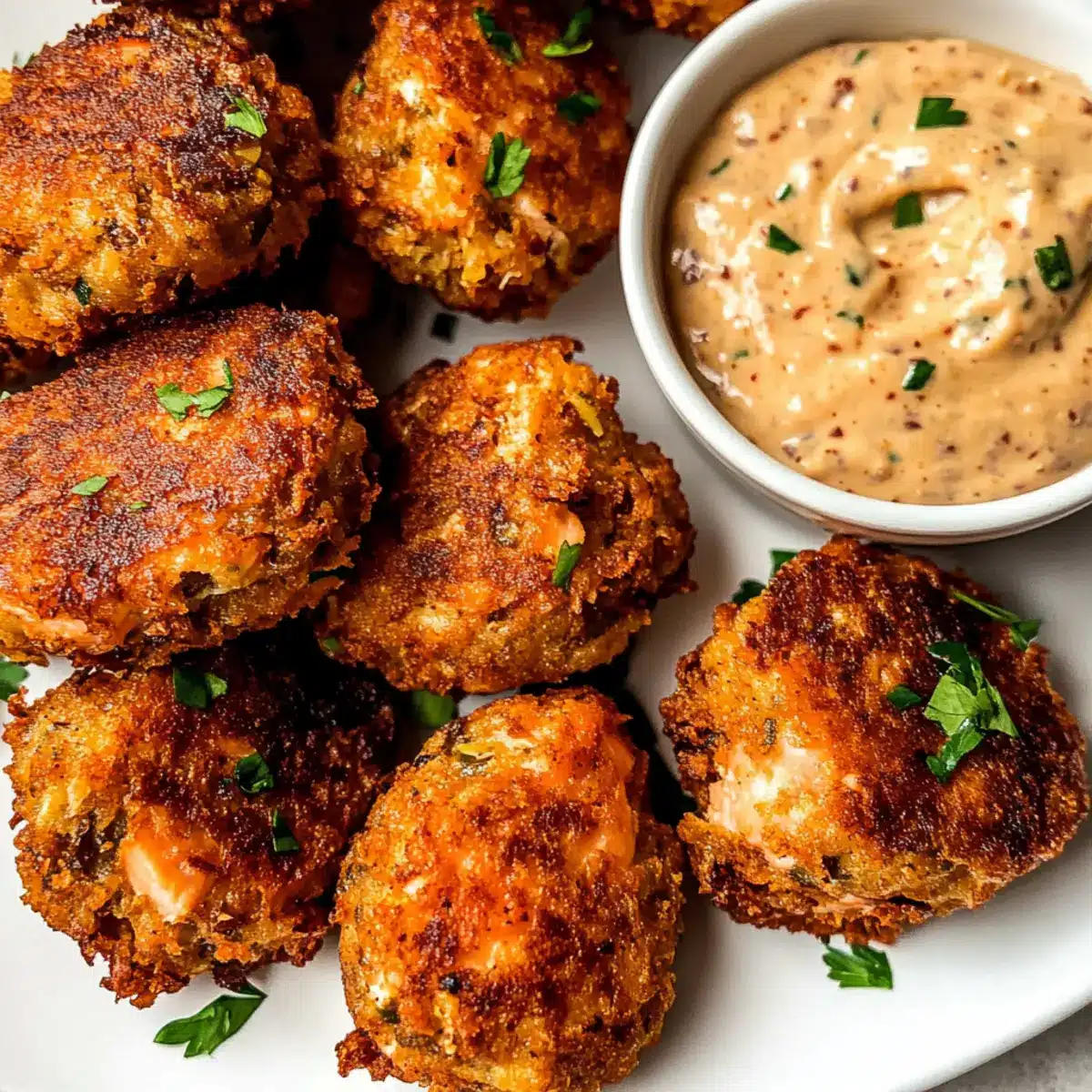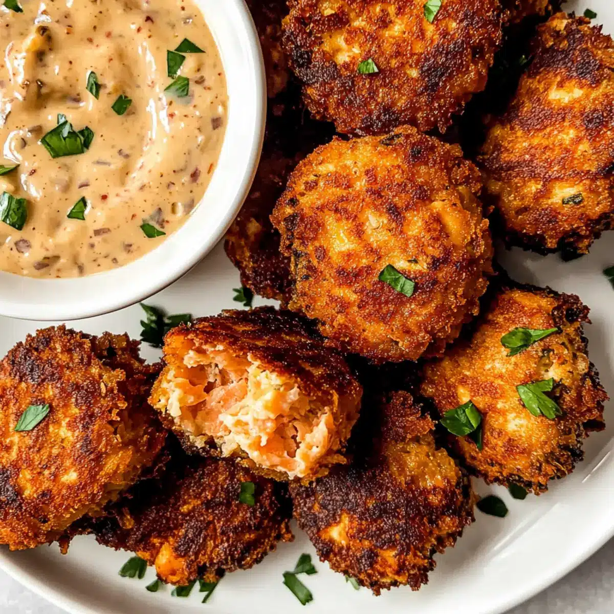 Now it’s time to indulge! Serve your delicious crispy pan fried salmon croquettes hot, alongside the remoulade sauce for dipping. These bites offer a delightful crunch and a tender interior, making them perfect for any meal. Pair them with a sharp salad or coleslaw for a complete experience, and watch as everyone reaches for seconds!