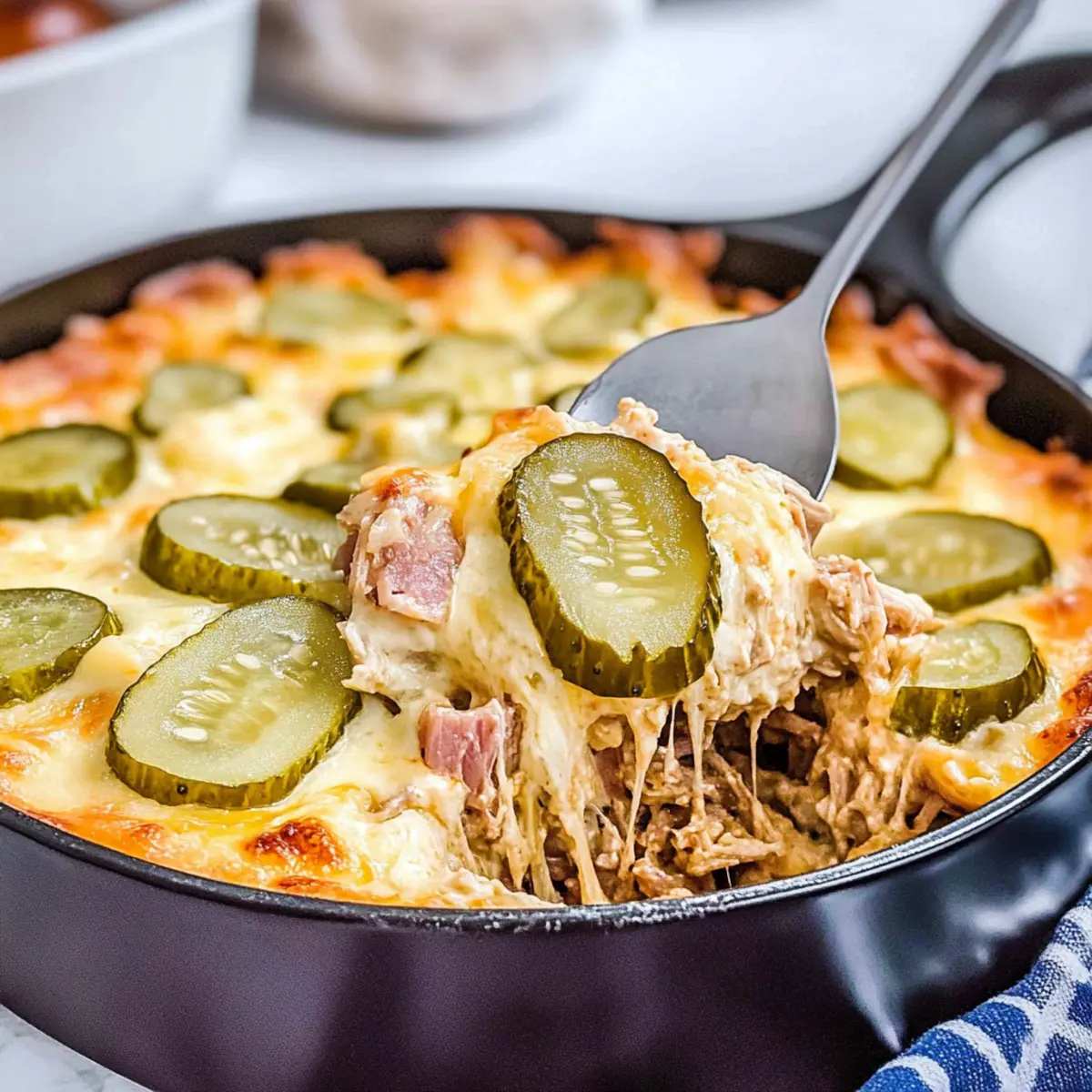 Remove the skillet from the oven with oven mitts, allowing it to cool for a minute. Before serving, consider garnishing with additional dill pickles for a pop of freshness and a hint of extra zing.