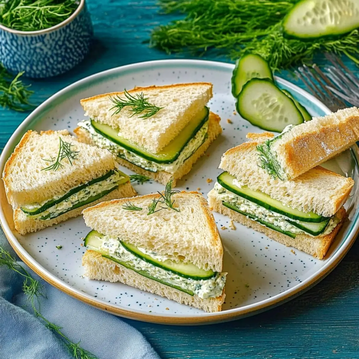 Carefully arrange the cut sandwiches on a decorative serving platter. For an elegant touch, garnish with extra dill or cucumber slices if desired. If you’re preparing these sandwiches ahead of time, cover them with a damp paper towel and refrigerate for up to 15 minutes to allow the flavors to meld before serving. Enjoy the refreshing taste of your classic cucumber sandwiches!