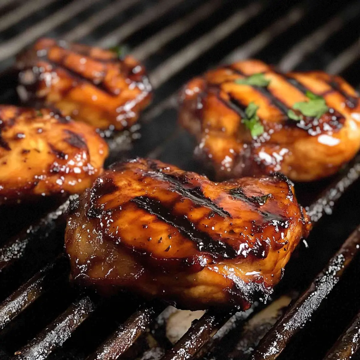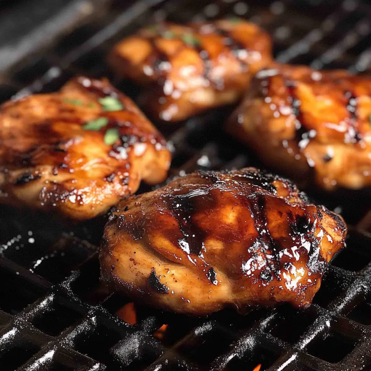 - Place the marinated chicken thighs directly on the hot grill. Cook for approximately 4 minutes until nice caramelized glaze forms. Flip the chicken for even cooking.