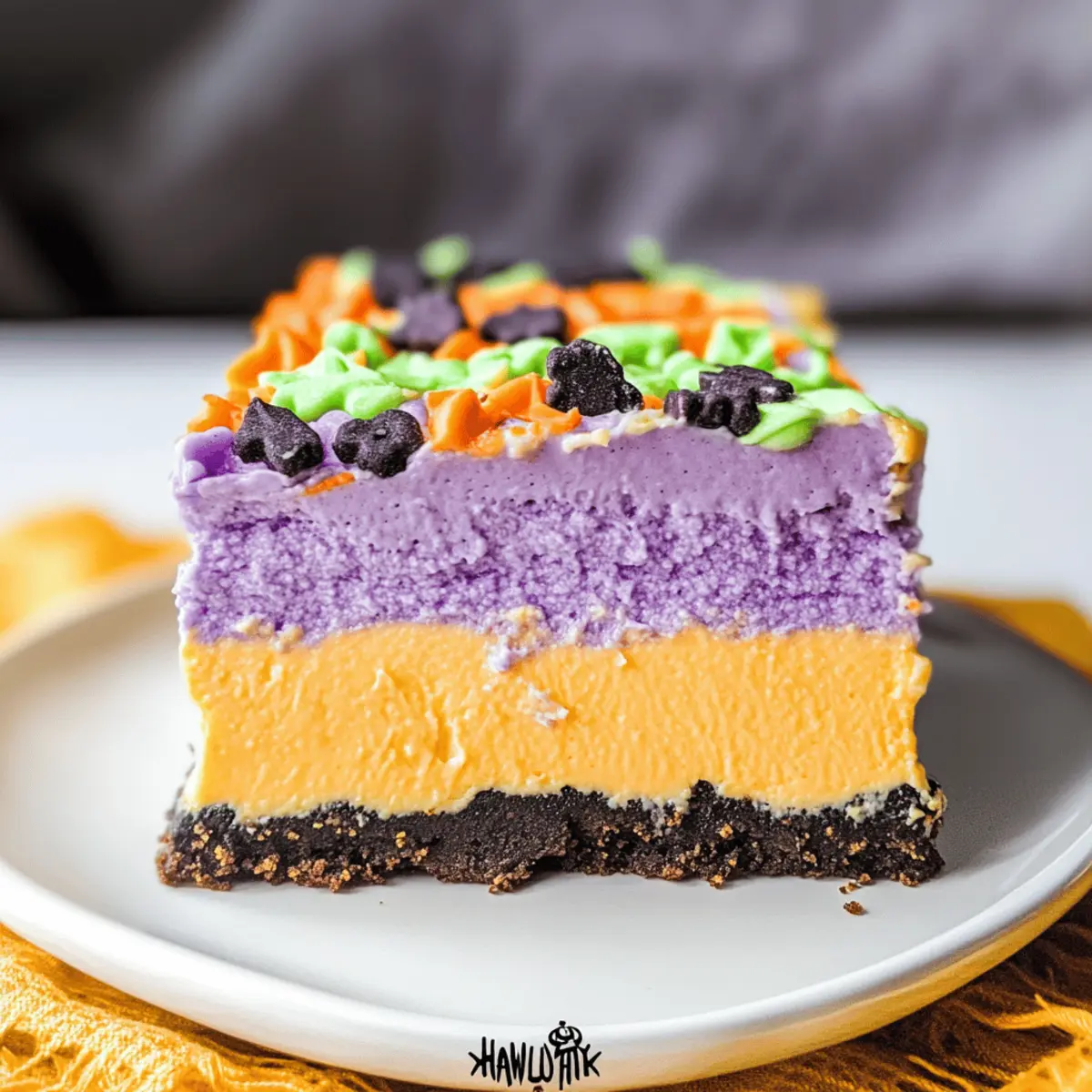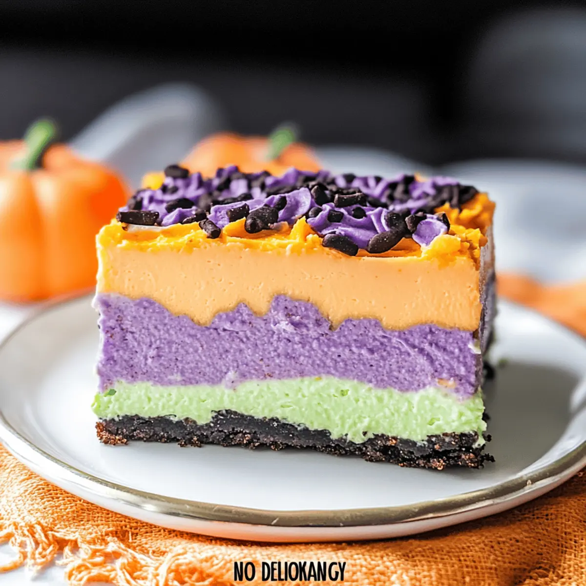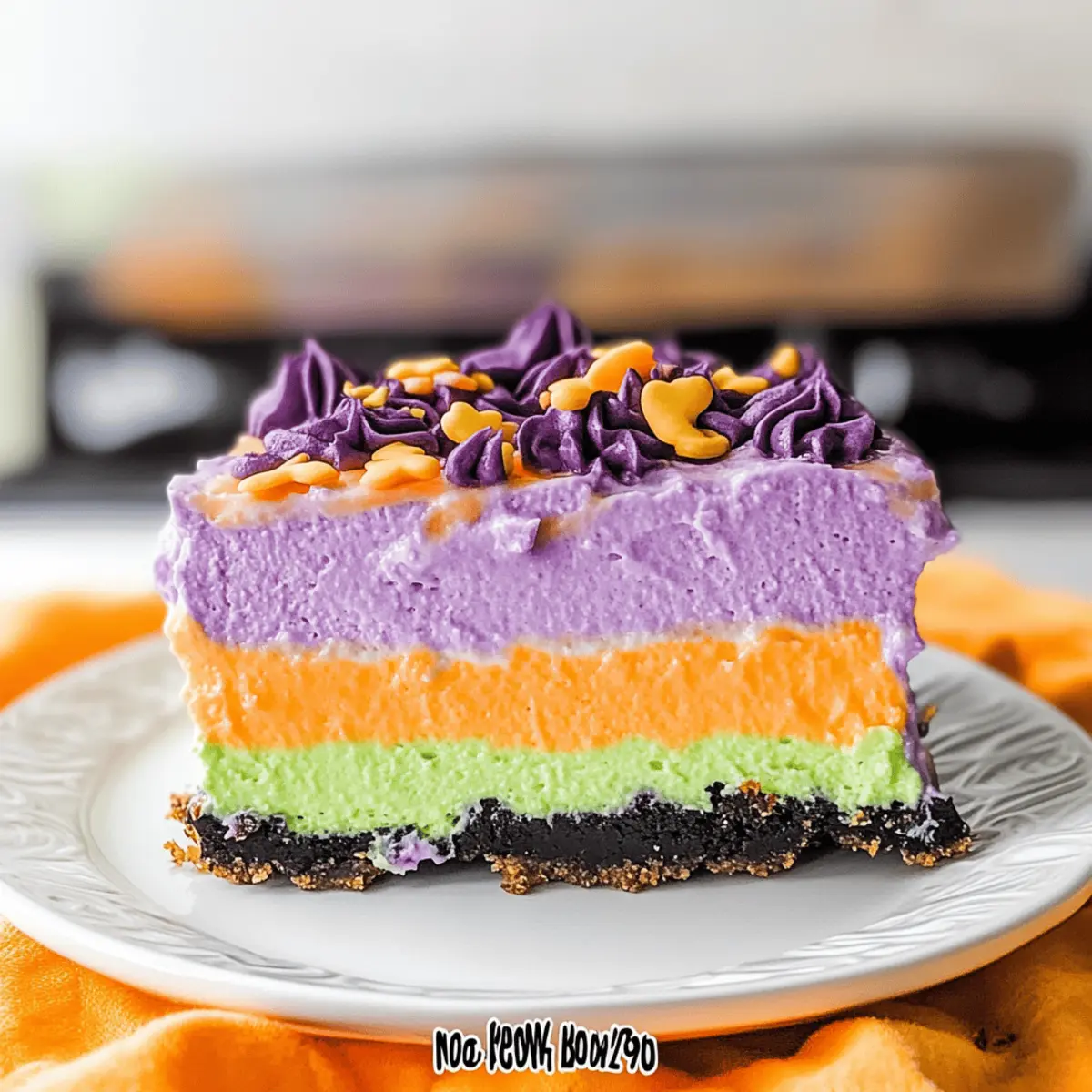 Delightfully Festive: This No-Bake Halloween Lush Dessert is visually stunning with its layers of vibrant colors, making it a perfect fit for any autumn celebration.