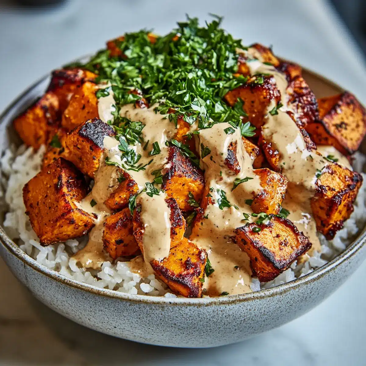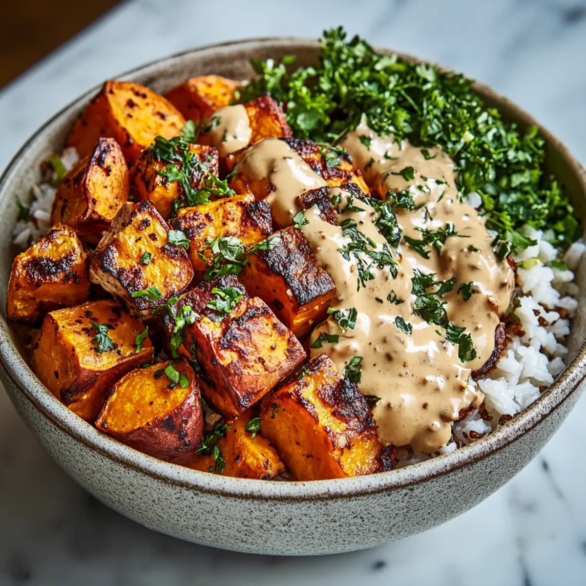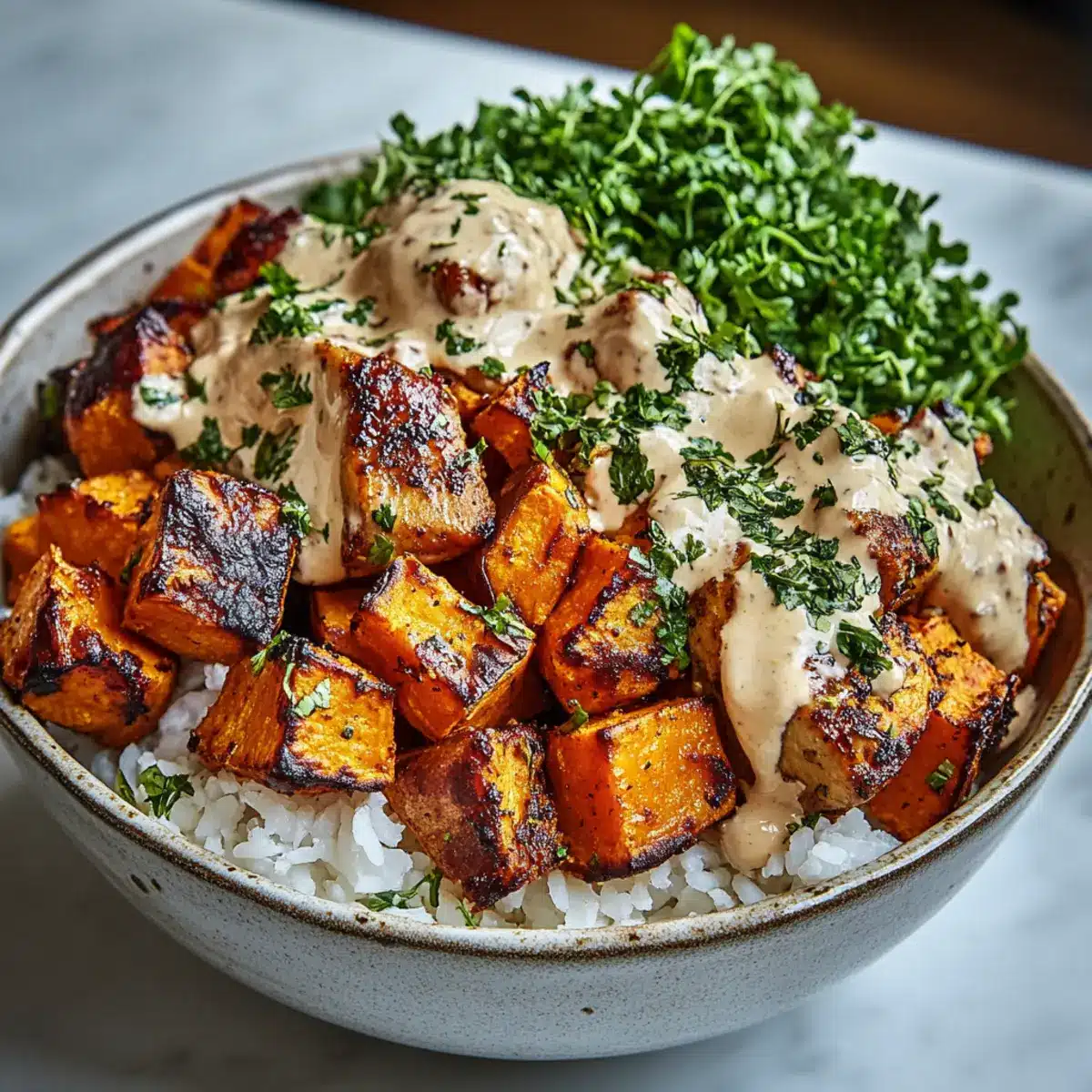 - Divide cooked rice into serving bowls. Layer with roasted sweet potatoes, pan-seared chicken, and optional green vegetables. Drizzle with creamy sauce and garnish with fresh herbs.