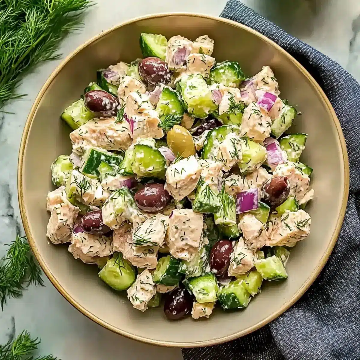 - Fold in the Vegetables: Gently mix in the cucumber, onion, feta, olives, and dill.