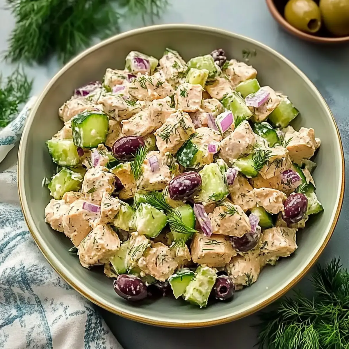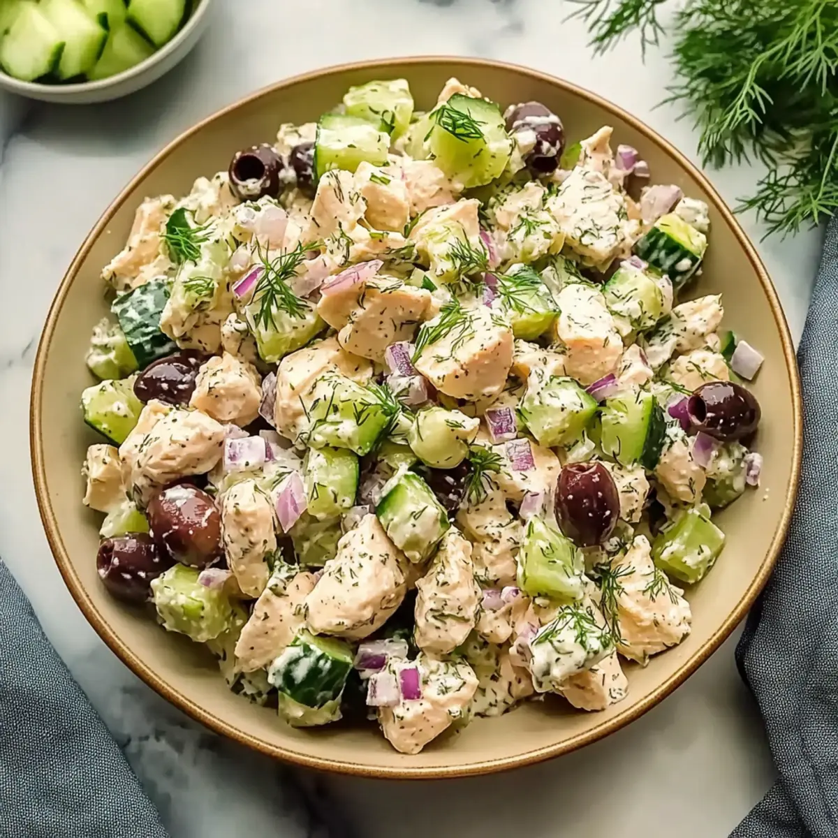 Now, carefully fold in the diced cucumber, minced onion, crumbled feta, chopped olives, and fresh dill into the chicken mixture. Take your time to mix gently; you want to incorporate everything without crushing the feta or cucumbers. This step is crucial, as it retains the crisp texture of the vegetables while melding the flavors beautifully.