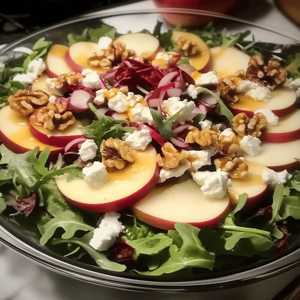 Begin by washing and drying 4 cups of mixed greens—any leafy greens will do! Then, quarter and thinly slice 2 Honeycrisp apples, keeping their vibrant skin for color and crunch. Crumble 4 ounces of feta cheese into bite-sized pieces and coarsely chop ½ cup of walnuts or pecans for added texture. Set these beautiful ingredients aside to assemble the salad.