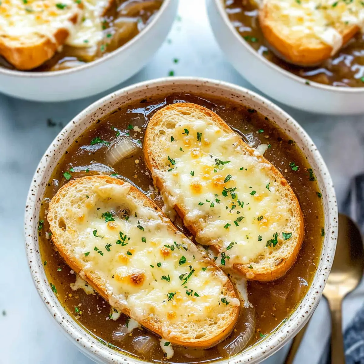 - Ladle the warm soup into oven-safe ramekins, placing baguette slices on top followed by grated cheese. Broil for 2-3 minutes until the cheese is golden brown.
