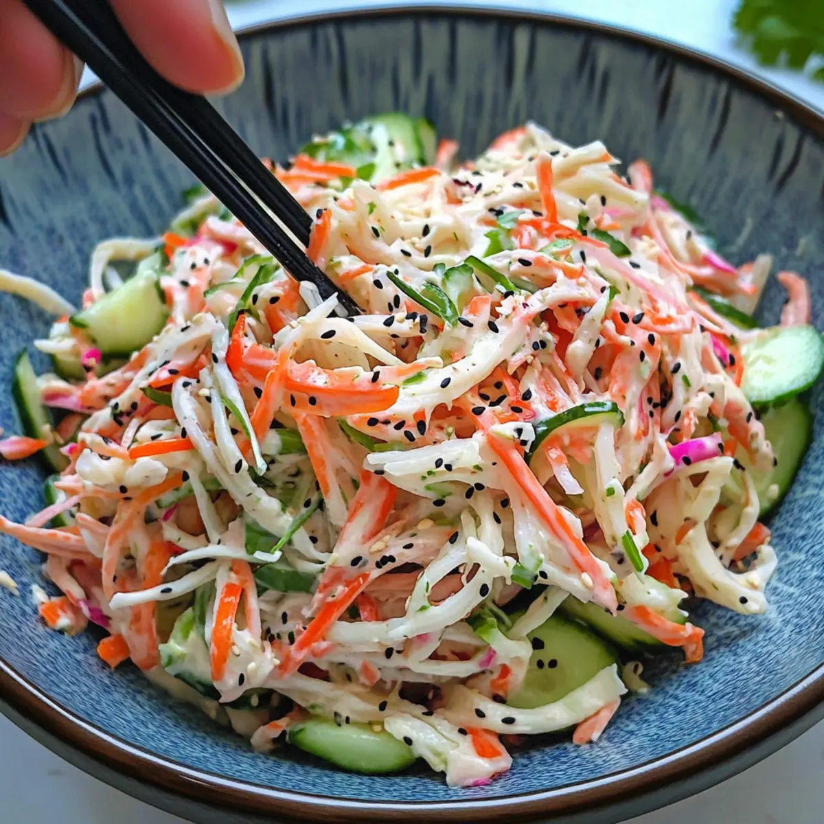 Fridge: Store leftover Kani Salad in an airtight container in the refrigerator for up to 3 days. If the salad begins to lose crispiness, refresh it with a bit of extra dressing before serving.