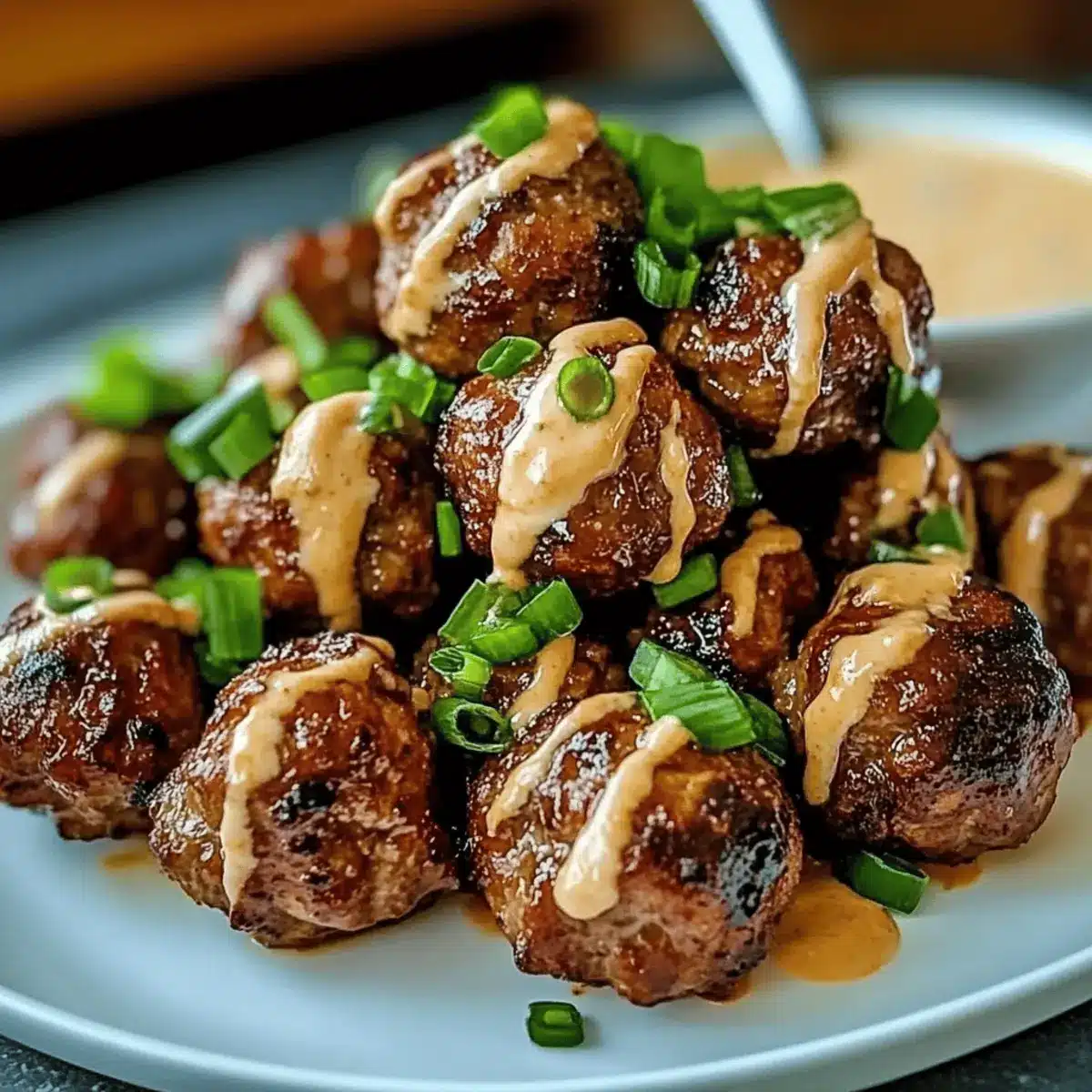 - Serve the glazed meatballs garnished with scallions or sesame seeds, with spicy mayo dip on the side.