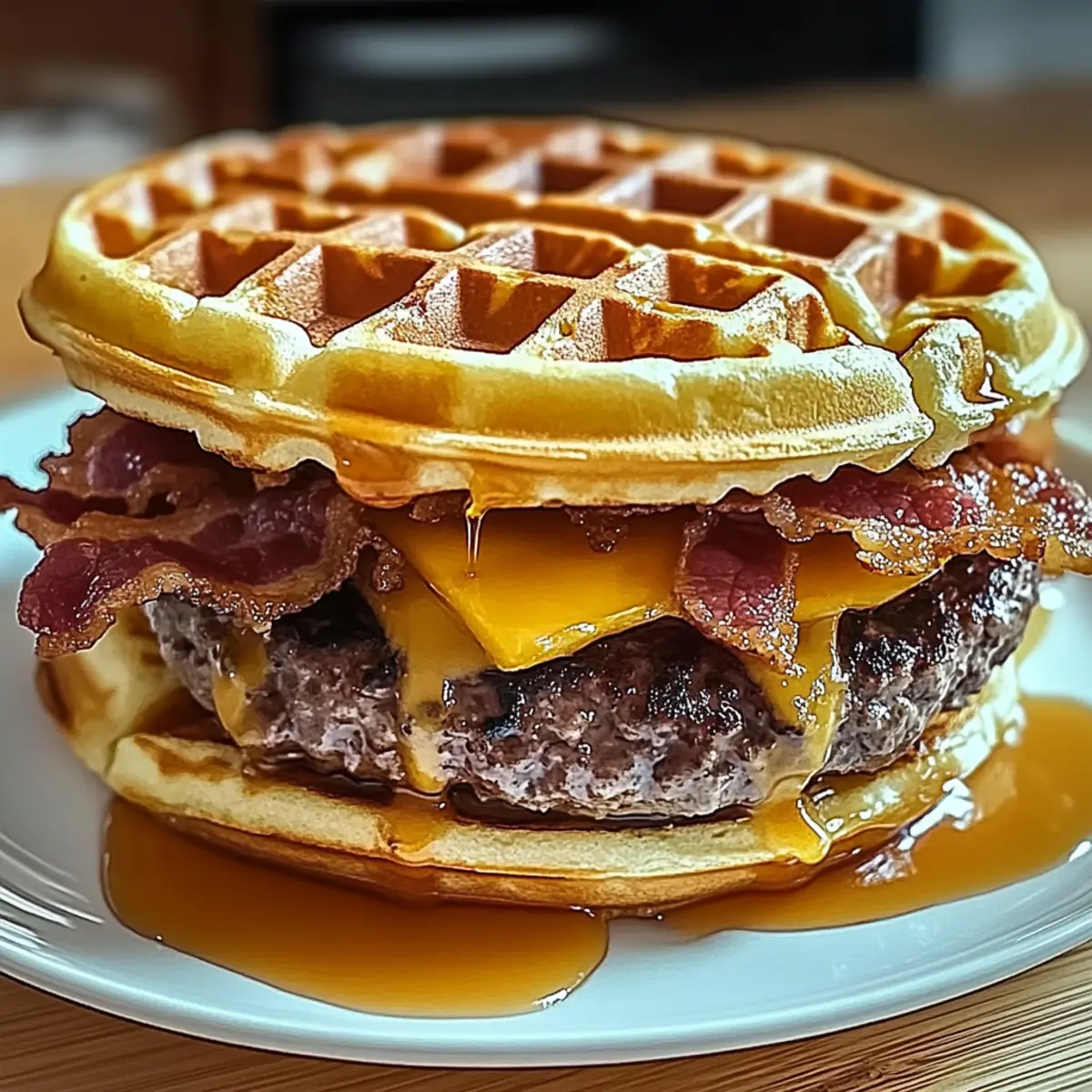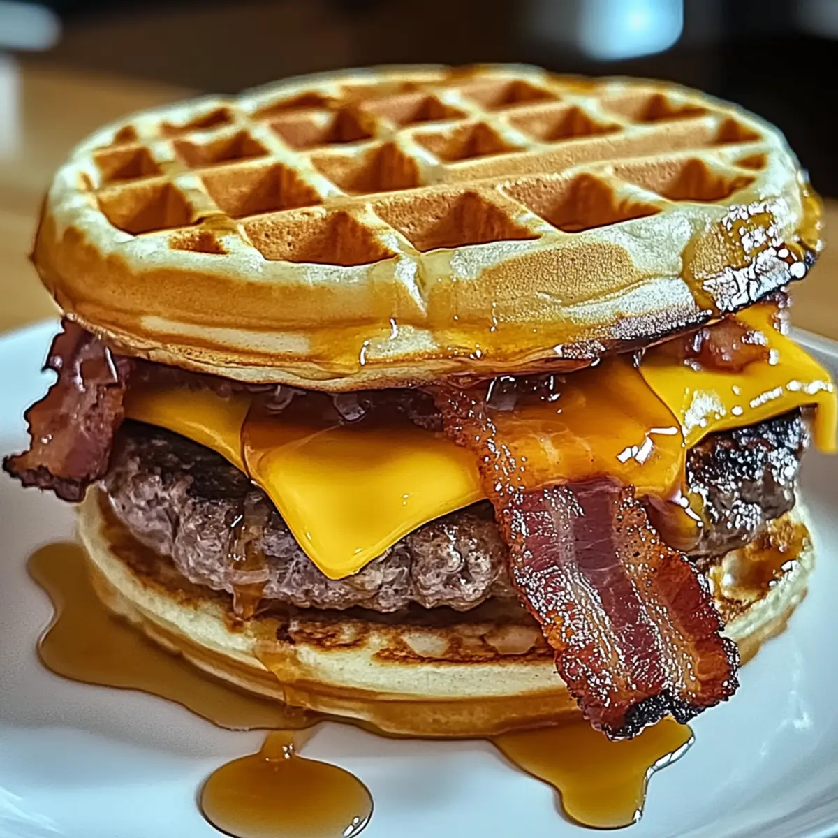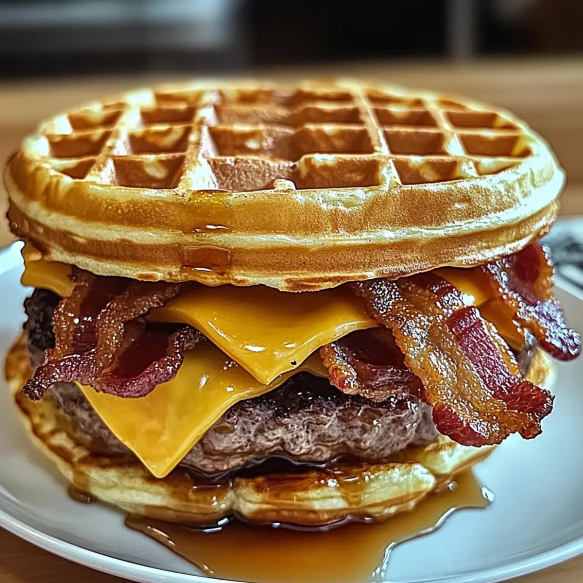 - Assemble the burger by layering a waffle, a cheese-patty, crispy bacon, and drizzling with maple syrup, then topping with another waffle.
