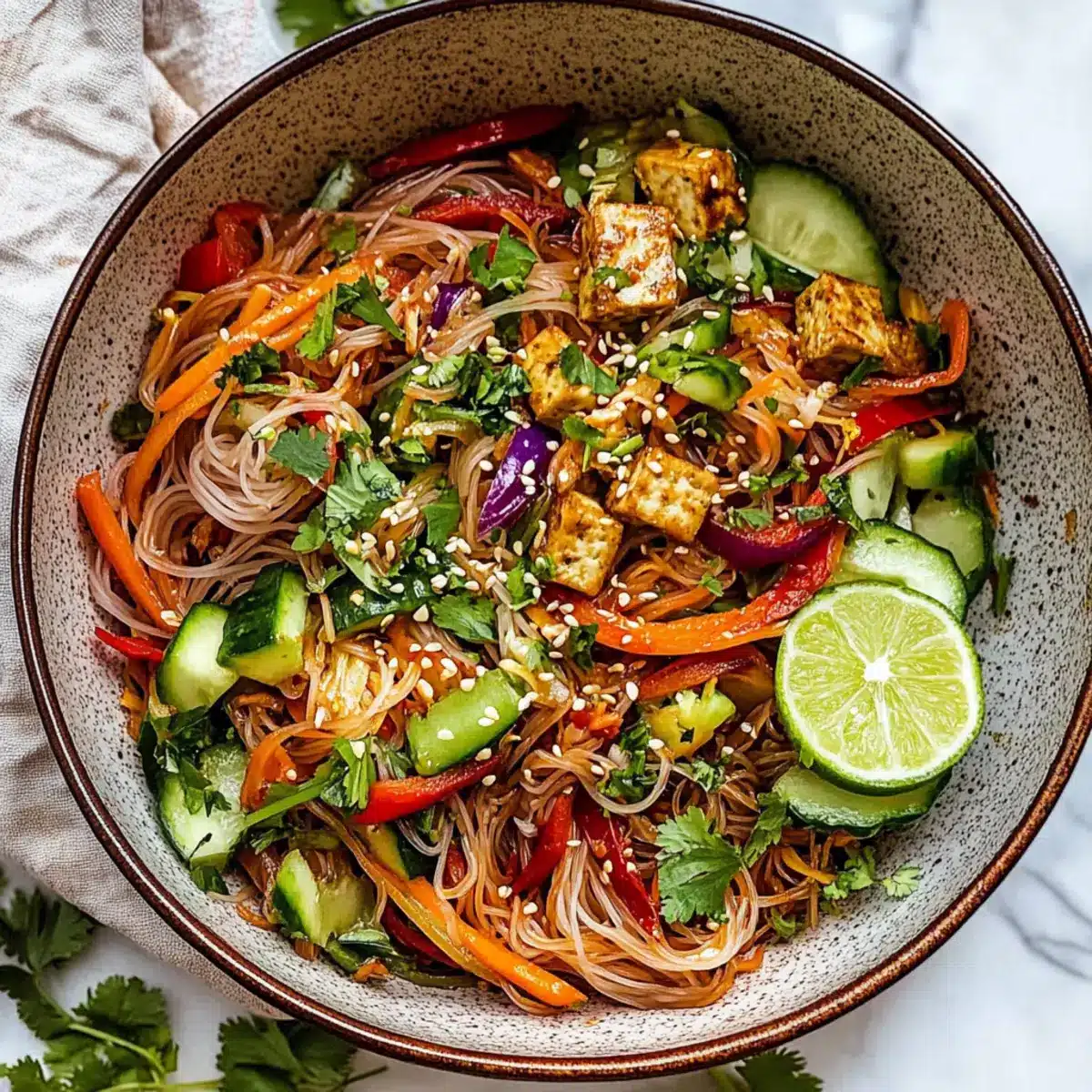 In a large mixing bowl, combine the cooled noodles with the colorful veggies like shredded carrots, sliced cucumber, and diced bell pepper. Add half of the crispy baked tofu, fresh herbs like cilantro and mint, and a handful of pistachios for a crunchy finish. Gently toss everything together to create a colorful base for your salad.