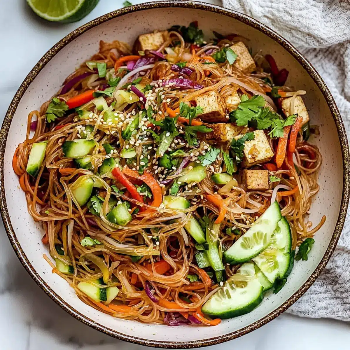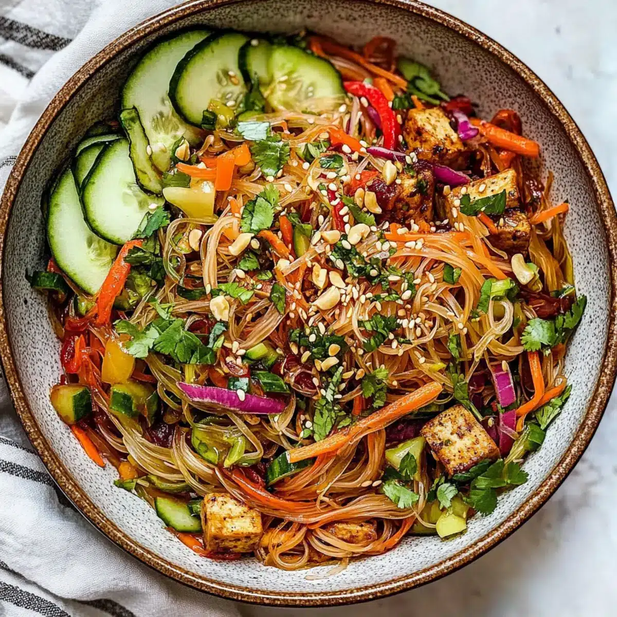 - In a large mixing bowl, combine the cooled noodles with shredded carrots, sliced cucumber, diced bell pepper, half of the crispy baked tofu, fresh herbs, and pistachios. Toss gently.