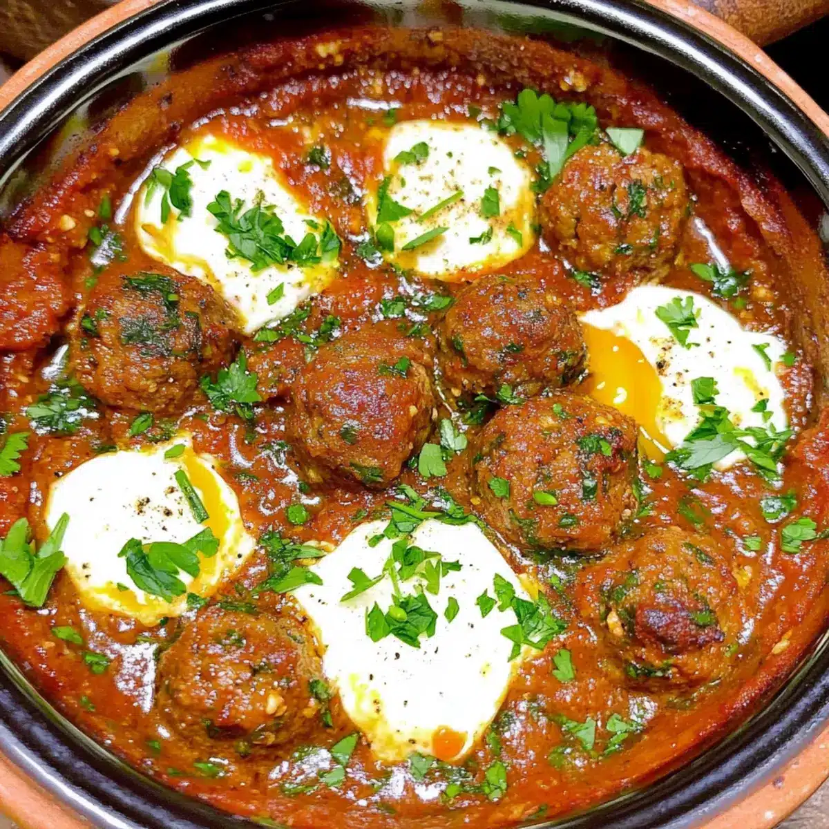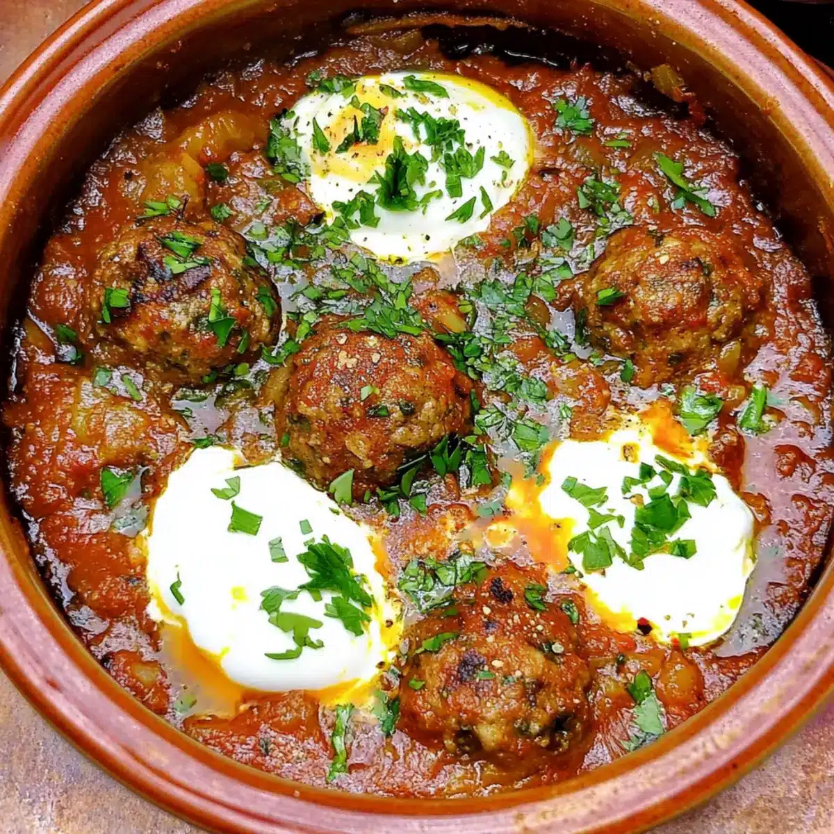 These Moroccan Meatball Tagine (Kefta Mkaouara) are perfect for meal prep enthusiasts looking to save time during busy weeknights! You can prepare the meatballs up to 24 hours in advance; simply form them and store covered in the refrigerator. The sauce can also be cooked ahead; refrigerate for up to 3 days. Reheat the sauce gently before adding the cold meatballs, and simmer until heated through. When you’re ready to redeem this delicious dish, poach the eggs directly in the sauce just before serving for that creamy finish. By prepping ahead, you’ll enjoy flavorful, comforting Moroccan Meatball Tagine without the hassle of last-minute cooking!