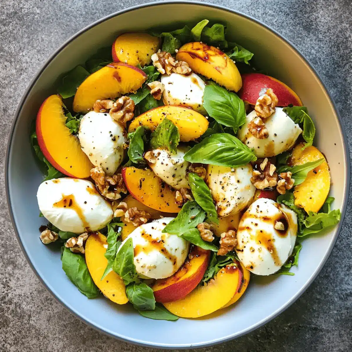 Next, introduce the creamy fresh mozzarella balls by gently halving them and adding them directly into the salad. Follow this with a sprinkle of toasted walnuts for a crunchy texture. As you add these elements, take a moment to ensure an even distribution to allow every bite to be a balanced blend of flavors in your Millionaire Peach Salad.