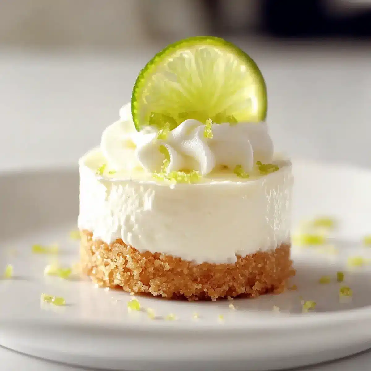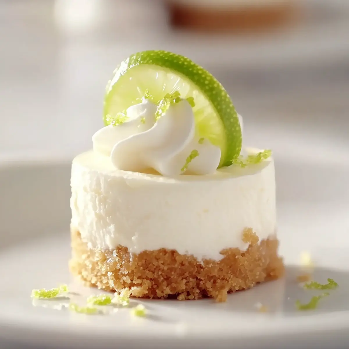 - Pipe whipped topping onto each cheesecake and garnish with lime zest or slices. Serve chilled.