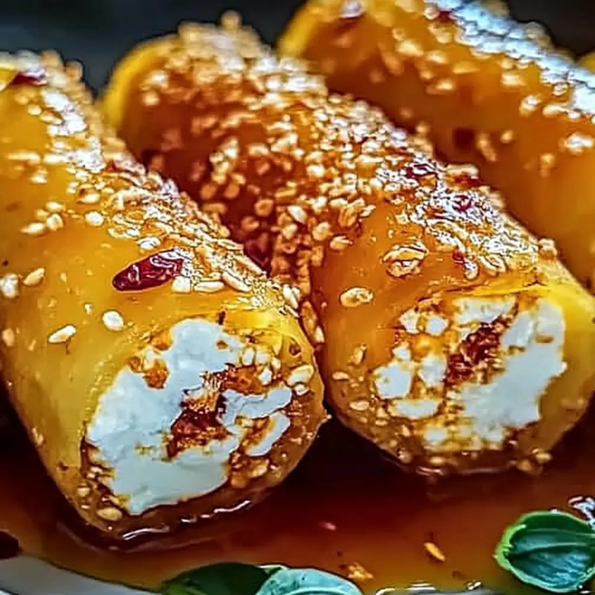 - Drizzle the warm chili honey over the baked feta rolls before serving.