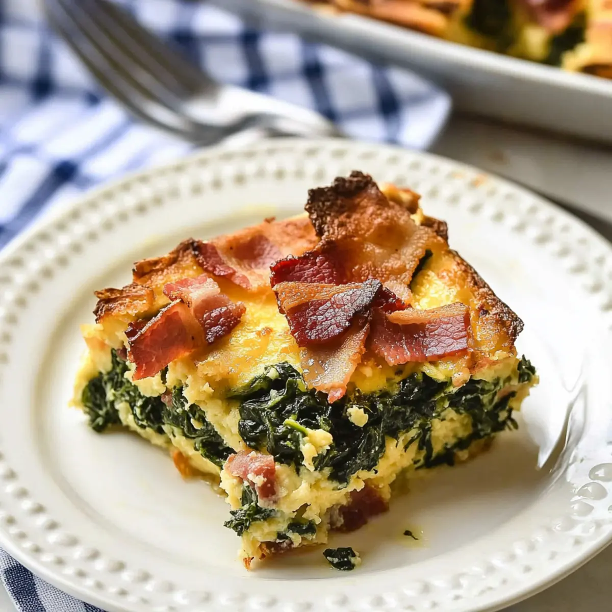 - Grease a 9x13 inch baking dish. Layer 5 cups of bread cubes, then the spinach mixture, crumbled bacon, and half of the shredded cheese. Pour the egg mixture over top and sprinkle with remaining cheese.