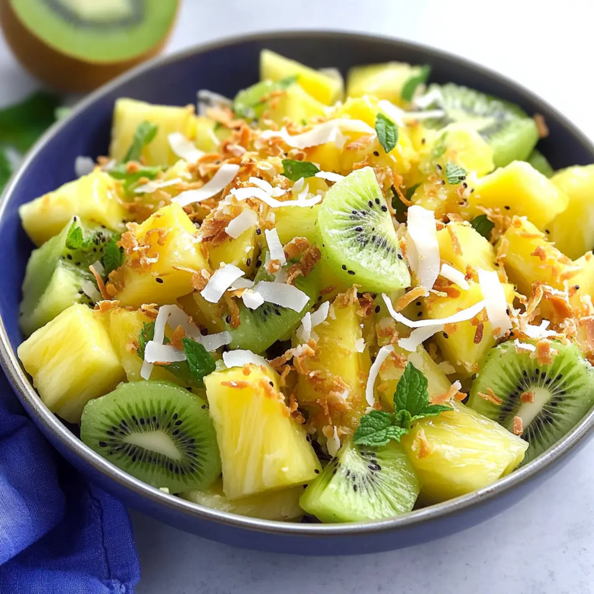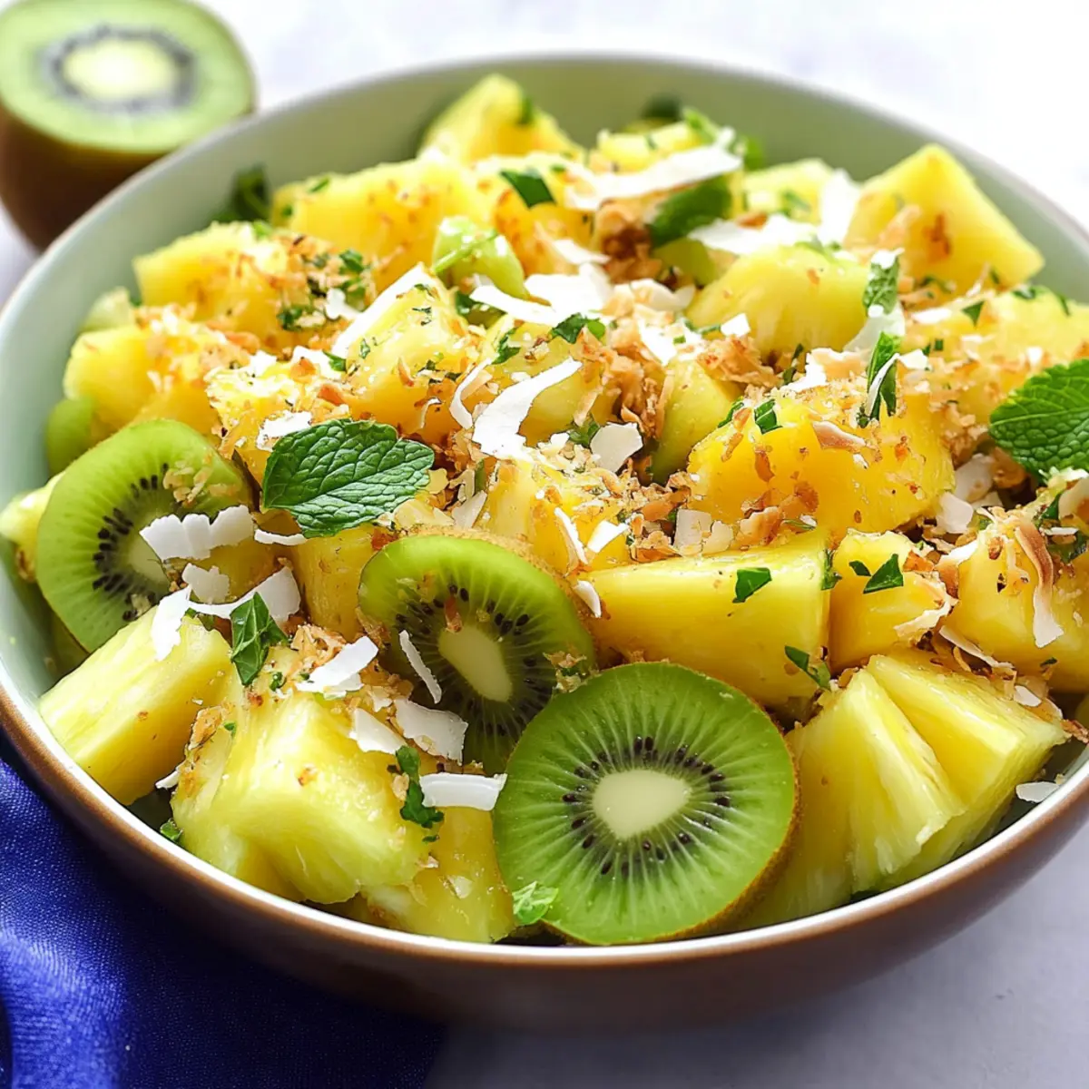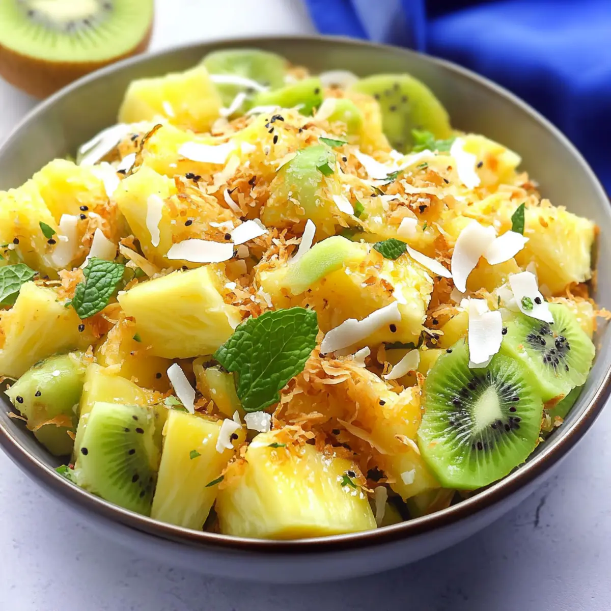 Once mixed, refrigerate the salad for about 10-15 minutes to chill and meld the flavors together, making it even more refreshing. Just before serving, sprinkle the toasted coconut on top to maintain its crunch. Present your beautiful Pineapple Kiwi Salad at gatherings, and watch it vanish as everyone enjoys the vibrant summer flavors!