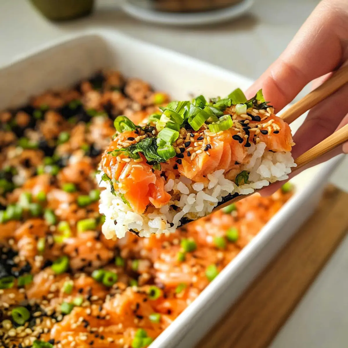 Preparing your Salmon Sushi Bake in advance is a game changer for busy weeknights! You can make the sushi rice and the creamy seafood mixture up to 24 hours ahead. To do this, cook your sushi rice, mix in the rice vinegar, sugar, and salt, then refrigerate it covered. For the seafood mix, combine flaked salmon, imitation crab, and Sriracha mayo in an airtight container and store it separately in the fridge. When you’re ready to serve, simply assemble the sushi bake by layering the ingredients in your baking dish and bake for about 10-15 minutes until golden. This way, you’ll enjoy that fresh, delicious flavor just as if you whipped it up on the spot!