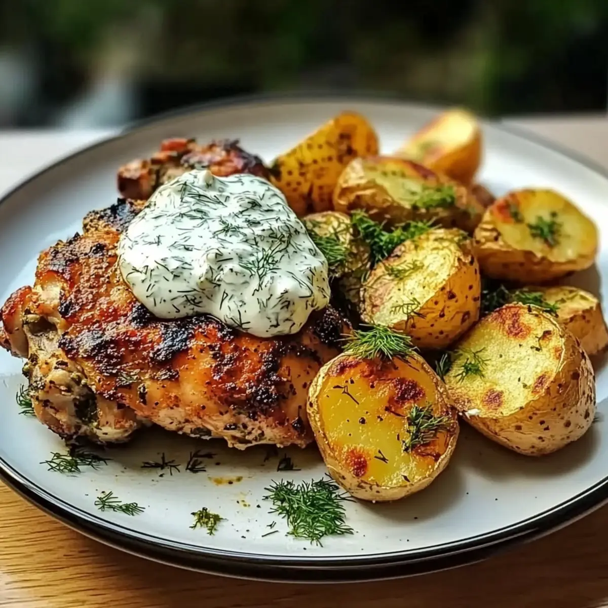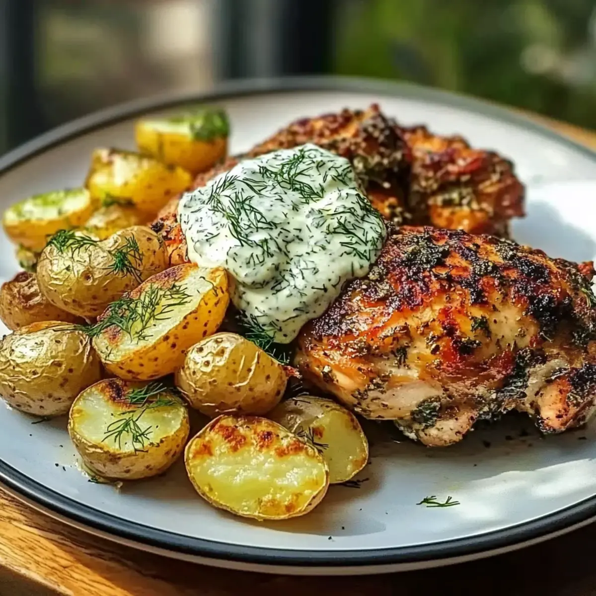 - On a large serving plate, arrange the sliced spicy yogurt marinated chicken alongside the crispy baby potatoes. Drizzle the dill feta cream over the chicken and potatoes.