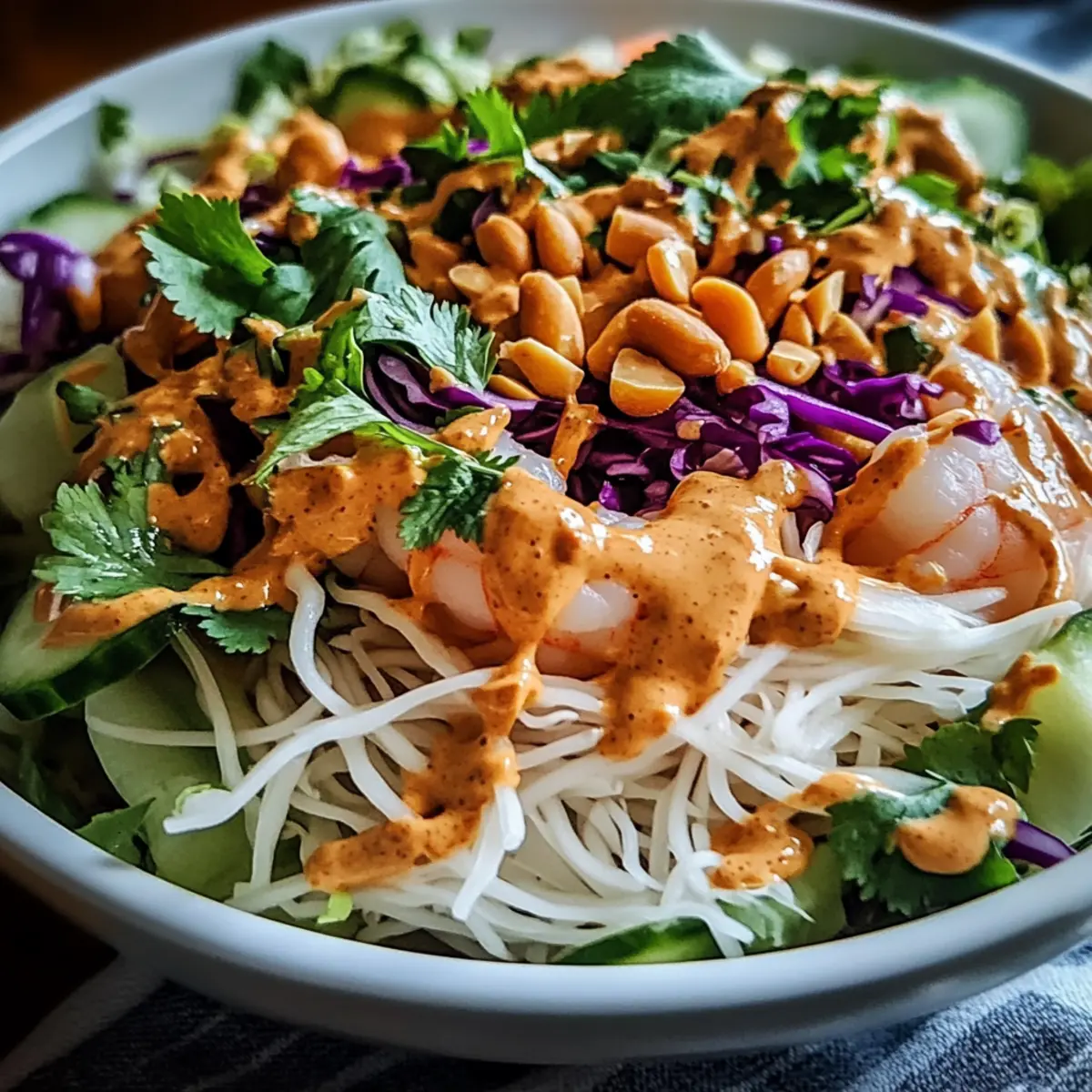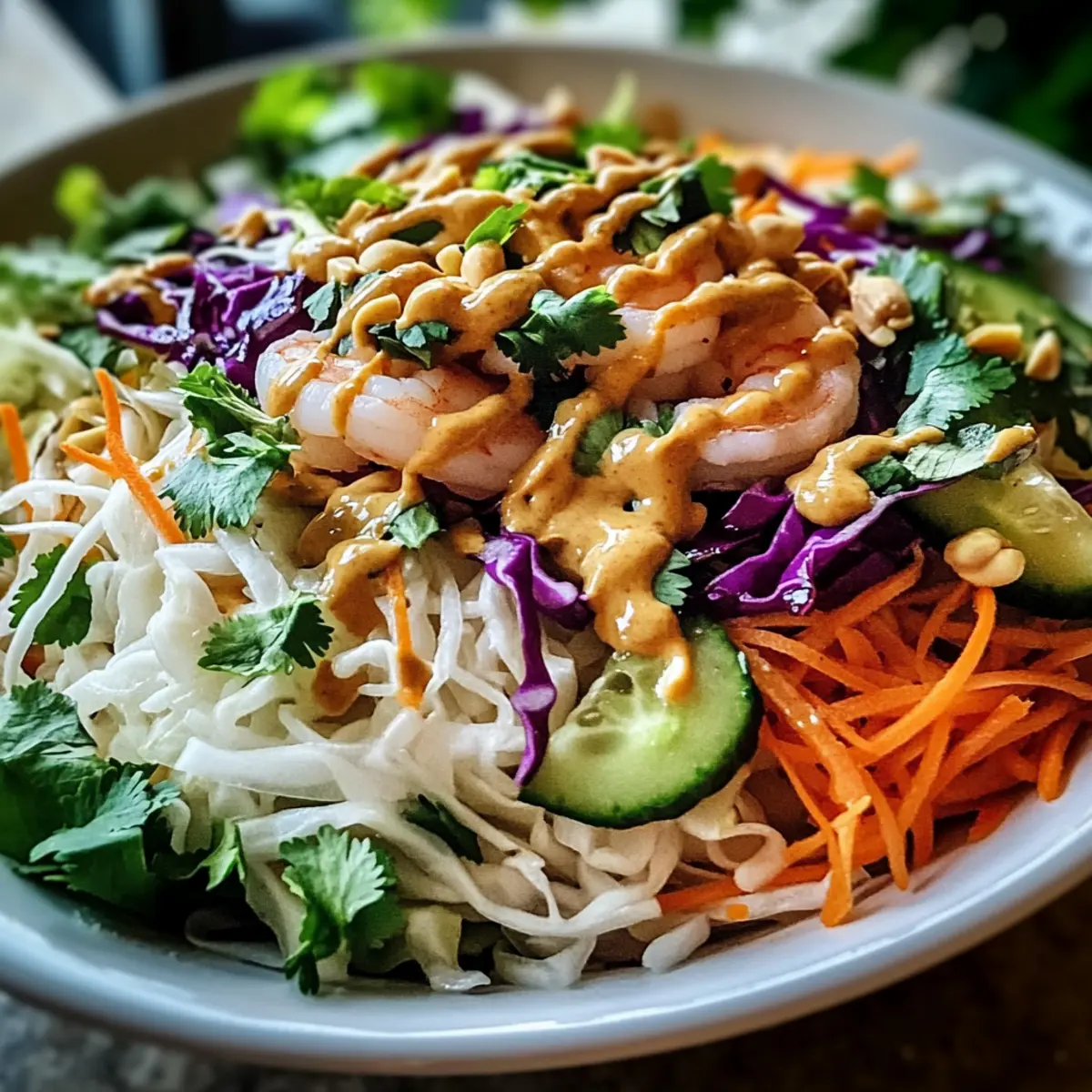 - Combine Ingredients: In a large bowl, mix shredded cabbage, carrots, bell pepper, cucumber, and cooked shrimp (if using). Add half of the peanuts and toss gently.