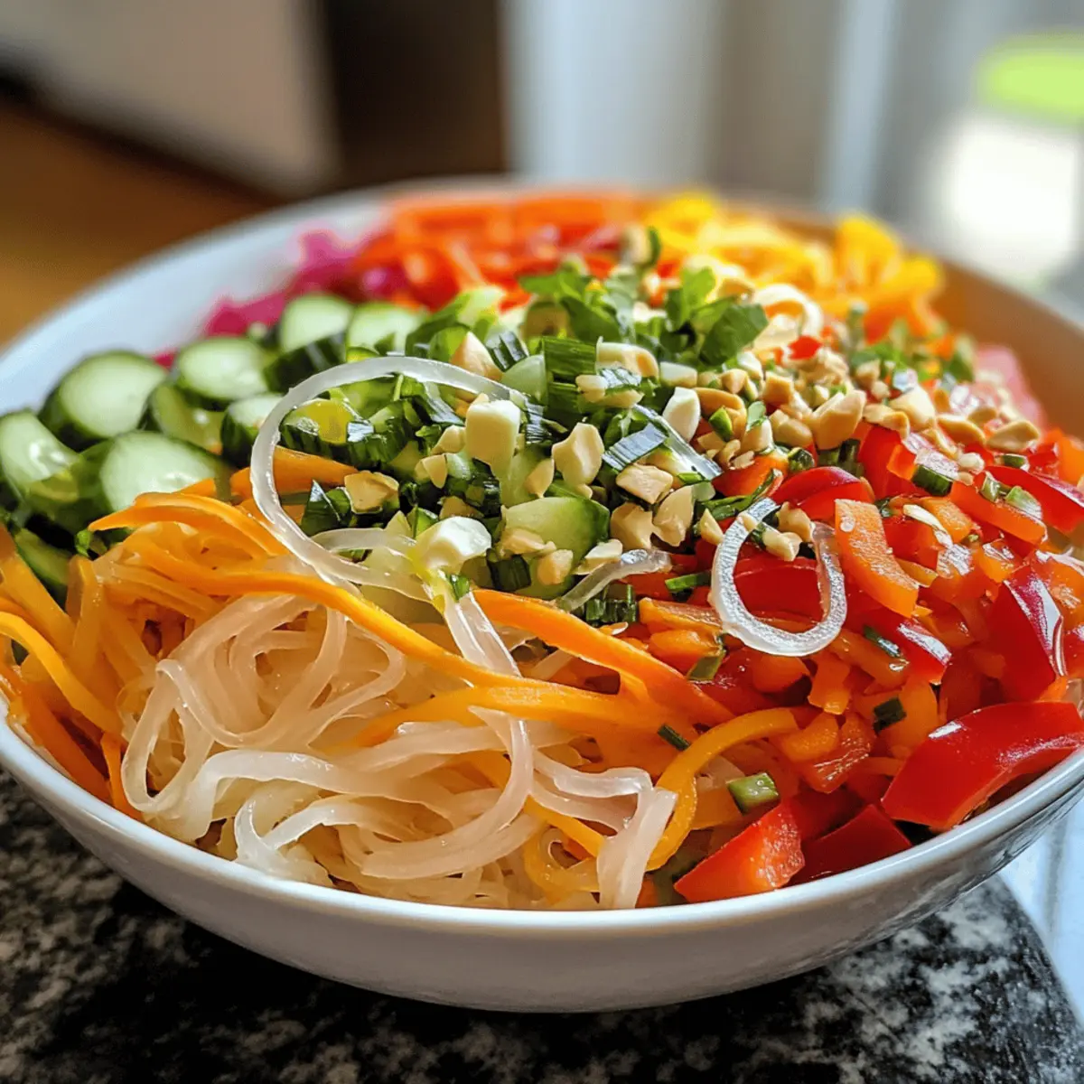 Finally, serve your Spring Roll Salad chilled, allowing the flavors to meld. If desired, sprinkle some crushed peanuts or sunflower seeds on top for added crunch. Presenting this colorful dish not only elevates your meal, it makes for an impressive side at gatherings or a delightful lunch.