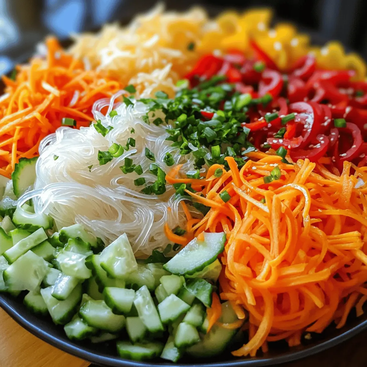 While the noodles are cooling, grab your cutting board and chop the veggies. Slice the carrots into thin strips, julienne the bell peppers, and slice the cucumber and green onions. You’ll want them to be colorful and vibrant, making your Spring Roll Salad visually appealing. Keep the cut vegetables organized on the board for easy access during assembly.
