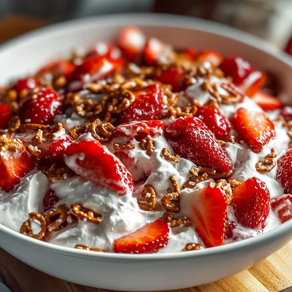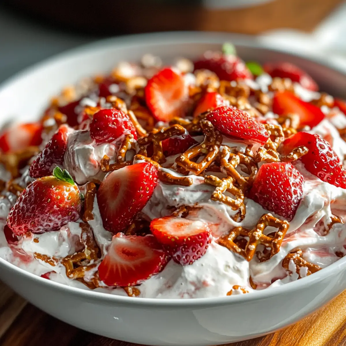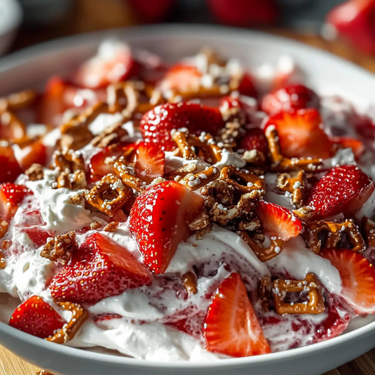- Layer the creamy strawberry mixture in a serving dish and top with half of the cooled pretzel crunch. Sprinkle the remaining pretzel crunch on top before serving.