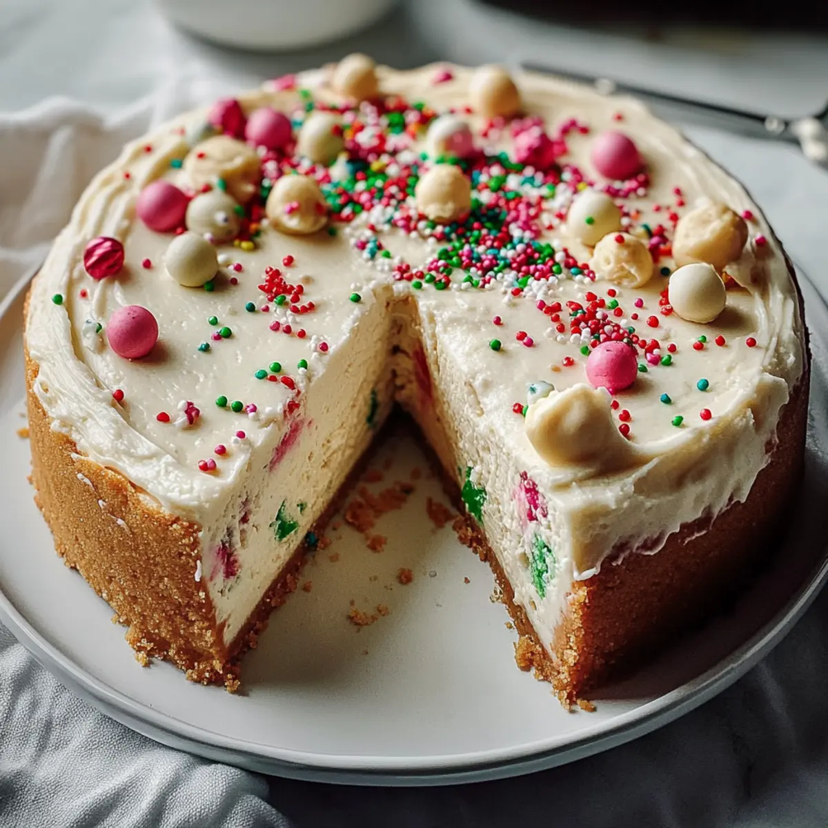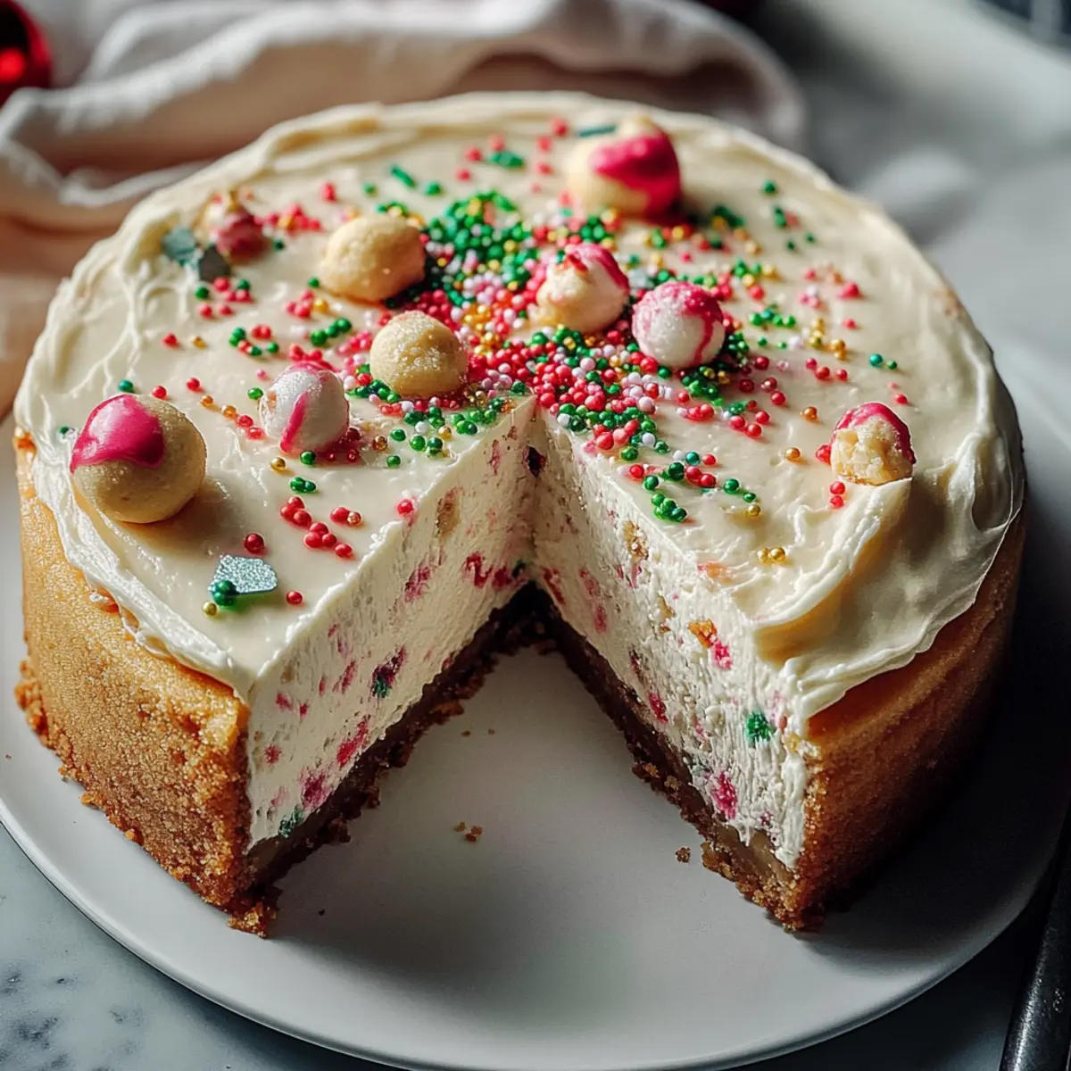 For the ganache, heat ½ cup of heavy cream in a small saucepan until it just begins to simmer. Pour it over 1 cup of white chocolate chips in a bowl and let it sit for a few minutes before stirring until smooth. Once the cheesecake is chilled, pour the ganache over the top, allowing it to drip down the edges. Finally, decorate with the remaining cookie dough balls and a sprinkle of festive Christmas sprinkles for a delightful finish!