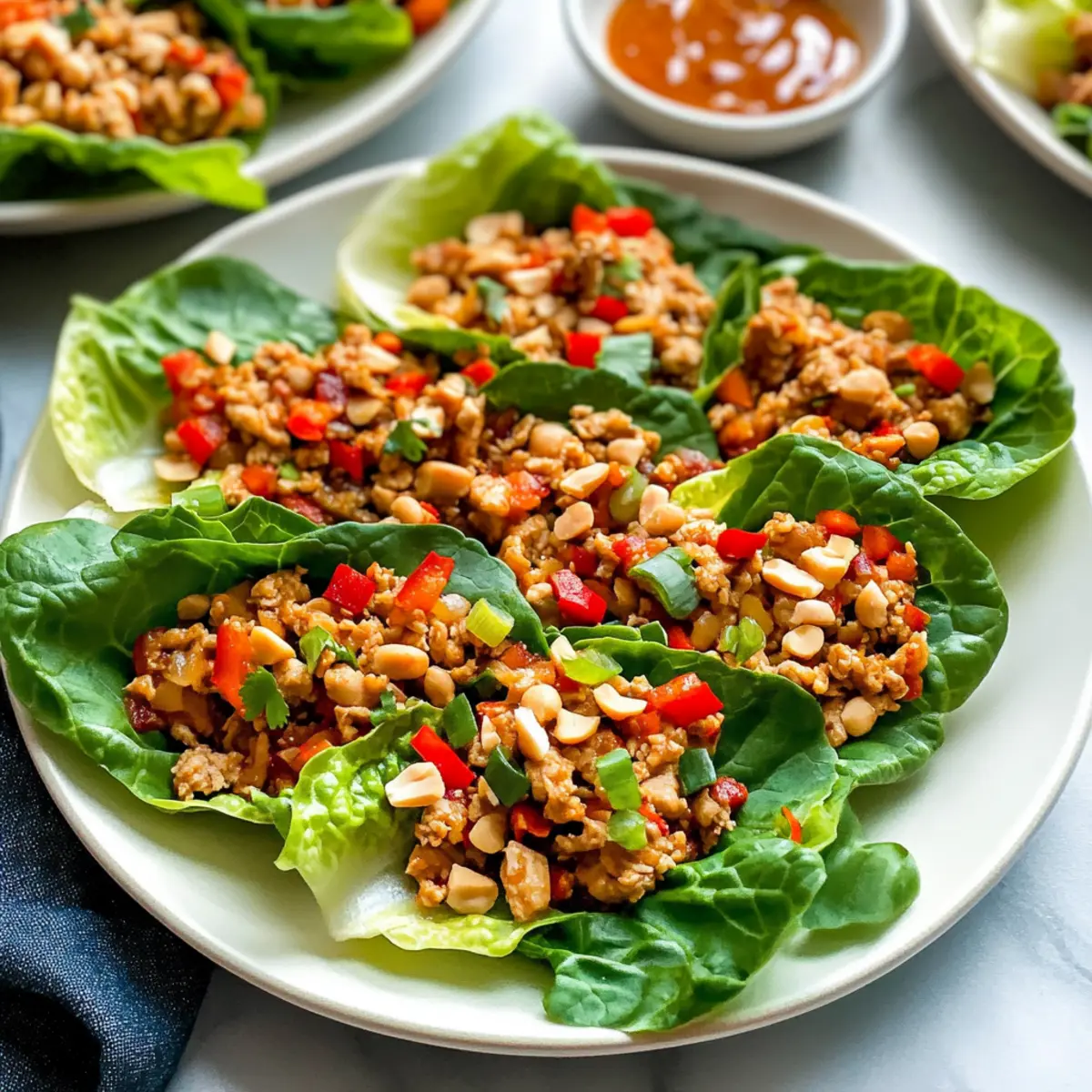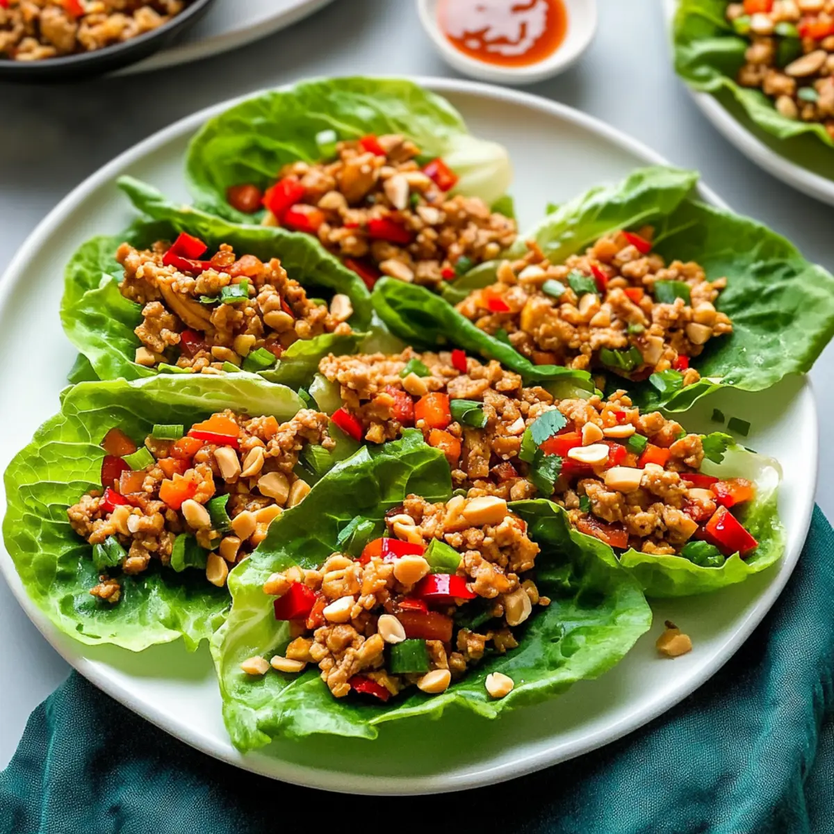 Spoon generous amounts of the filling into individual lettuce leaves, forming wraps. If desired, top with a drizzle of spicy sauce or additional crushed peanuts for an extra kick. These fresh, healthy Thai Chicken Lettuce Wraps are now ready to enjoy—great for sharing at the dinner table or packed for a delicious lunch!