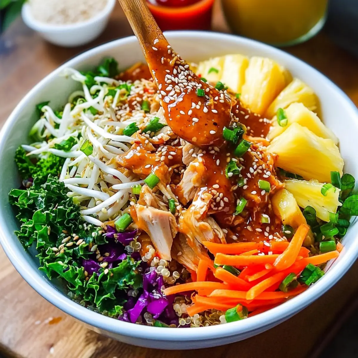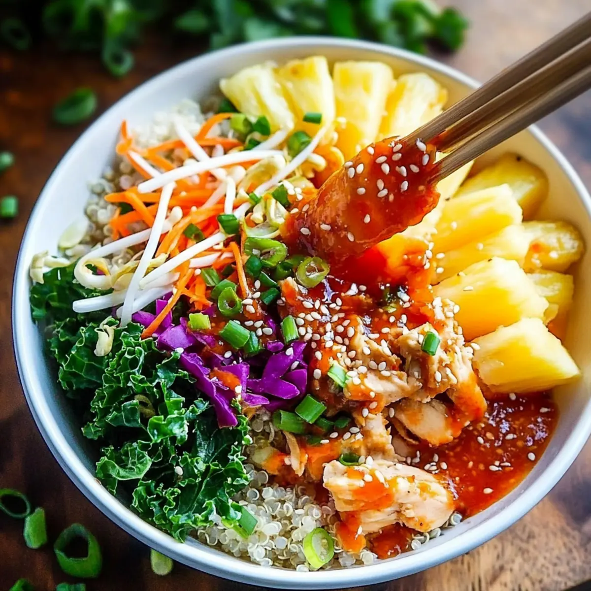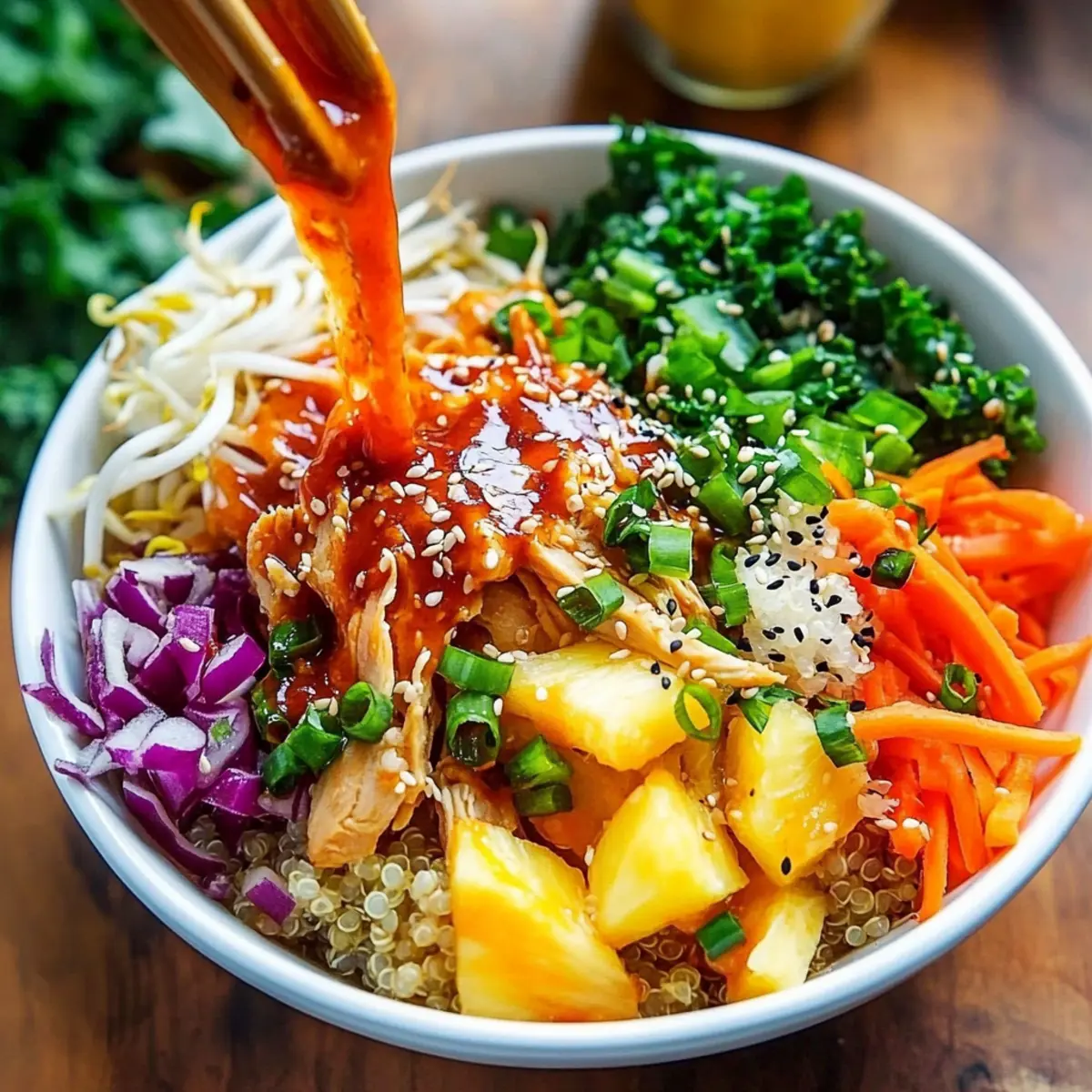 - Assemble bowls with quinoa as the base. Layer with massaged kale, bean sprouts, carrots, pineapple, and red pepper. Top with shredded chicken.