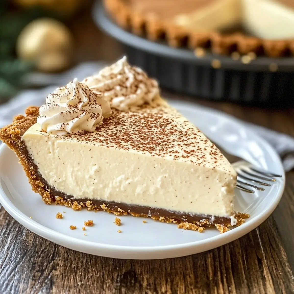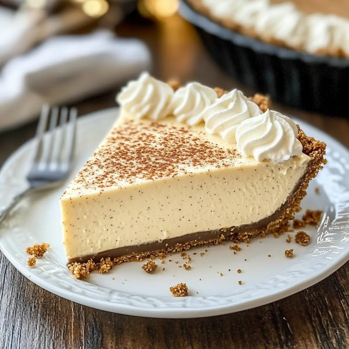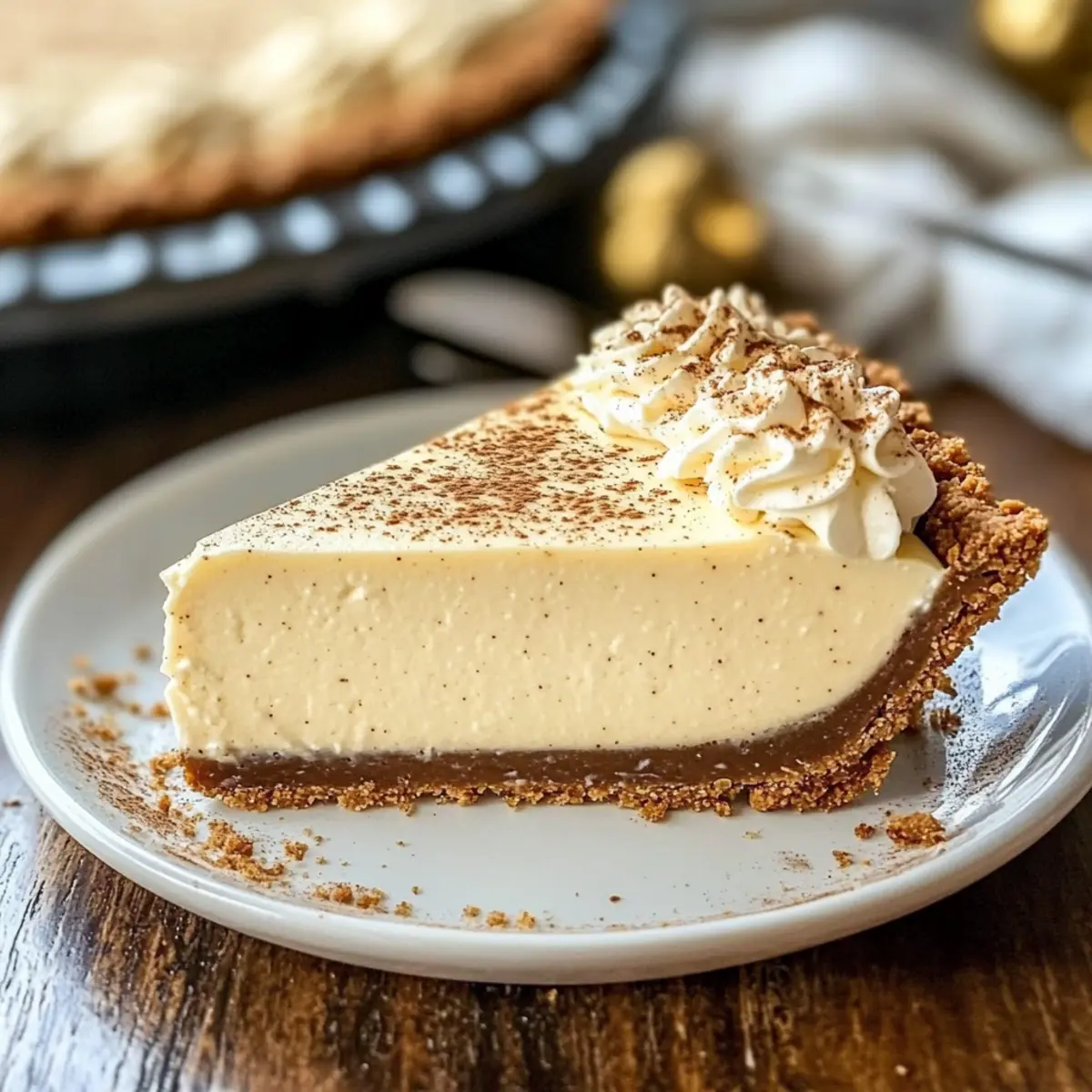 Crowd-pleaser: This pie is bound to delight both eggnog lovers and newcomers, creating buzz and smiles at any gathering—pair it with some hot chocolate or spiced apple cider from your holiday menu for a cozy treat!