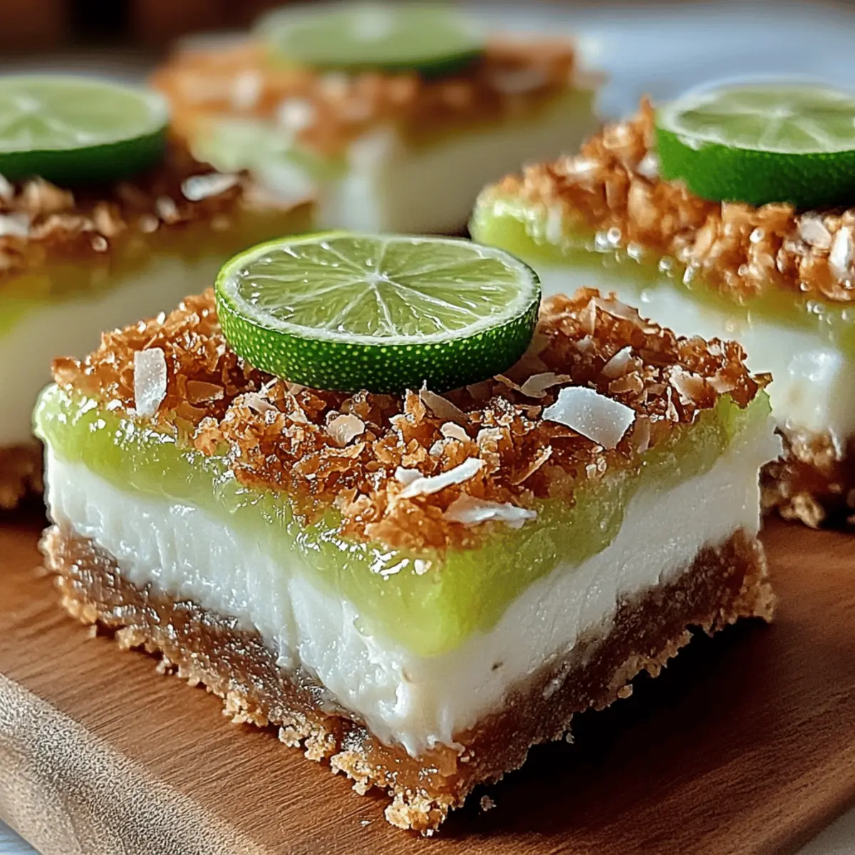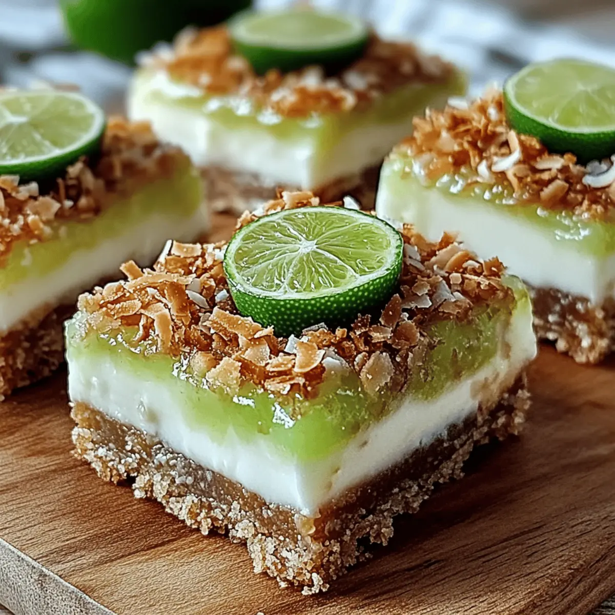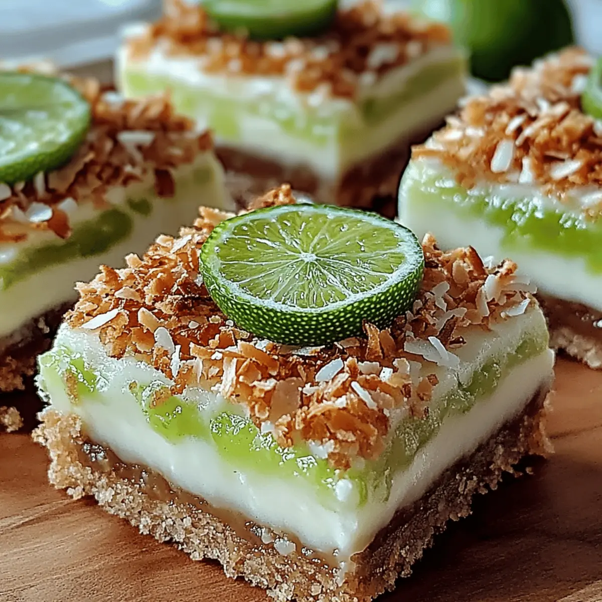 These Tropical Chill Coconut Lime Bars are perfect for busy home cooks looking to save time! You can prepare the crust up to 24 hours in advance. Just mix the graham cracker crumbs, shredded coconut, sugar, and melted butter, then press it into the pan and bake. Allow it to cool completely before adding the filling. The filling can also be made a day ahead; simply prepare it and spread it over the cooled crust, then cover and freeze for up to 3 days. This helps maintain the texture while saving you time during busy weekdays. To serve, let the bars sit at room temperature for 5-10 minutes before slicing, ensuring each bite is just as refreshing as the moment you made them!