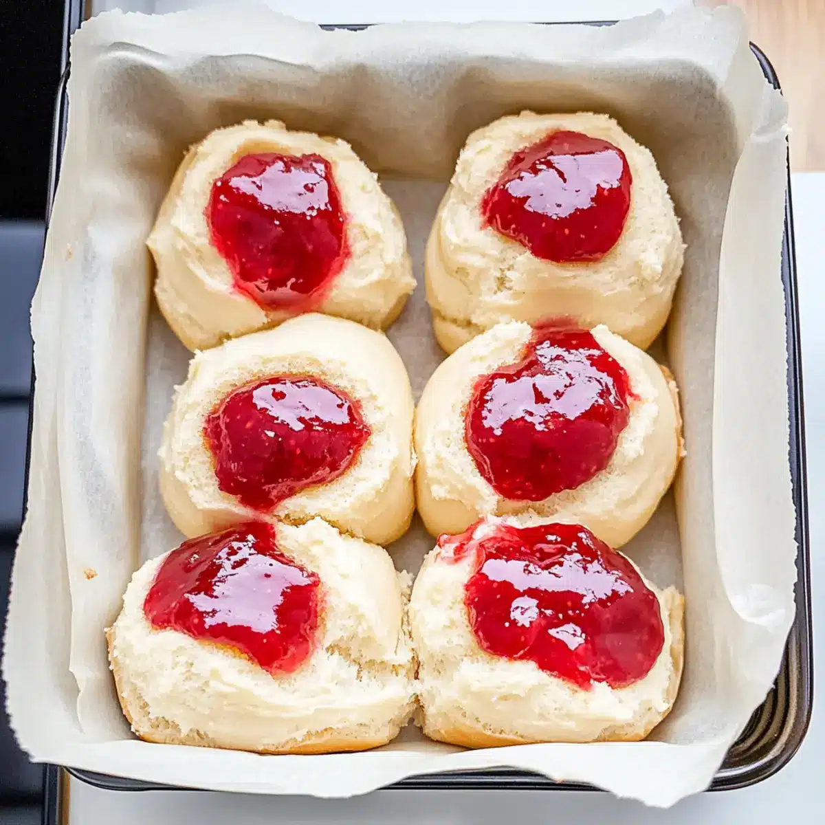 Arrange the filled buns on a greased baking tray, leaving space between each for expansion. Cover them with a kitchen towel and allow them to rise again for about 30 minutes. During this time, they will puff up, creating a lovely soft texture and ensuring each Vanilla Cream & Strawberry Jam Streusel Bun is light and airy.